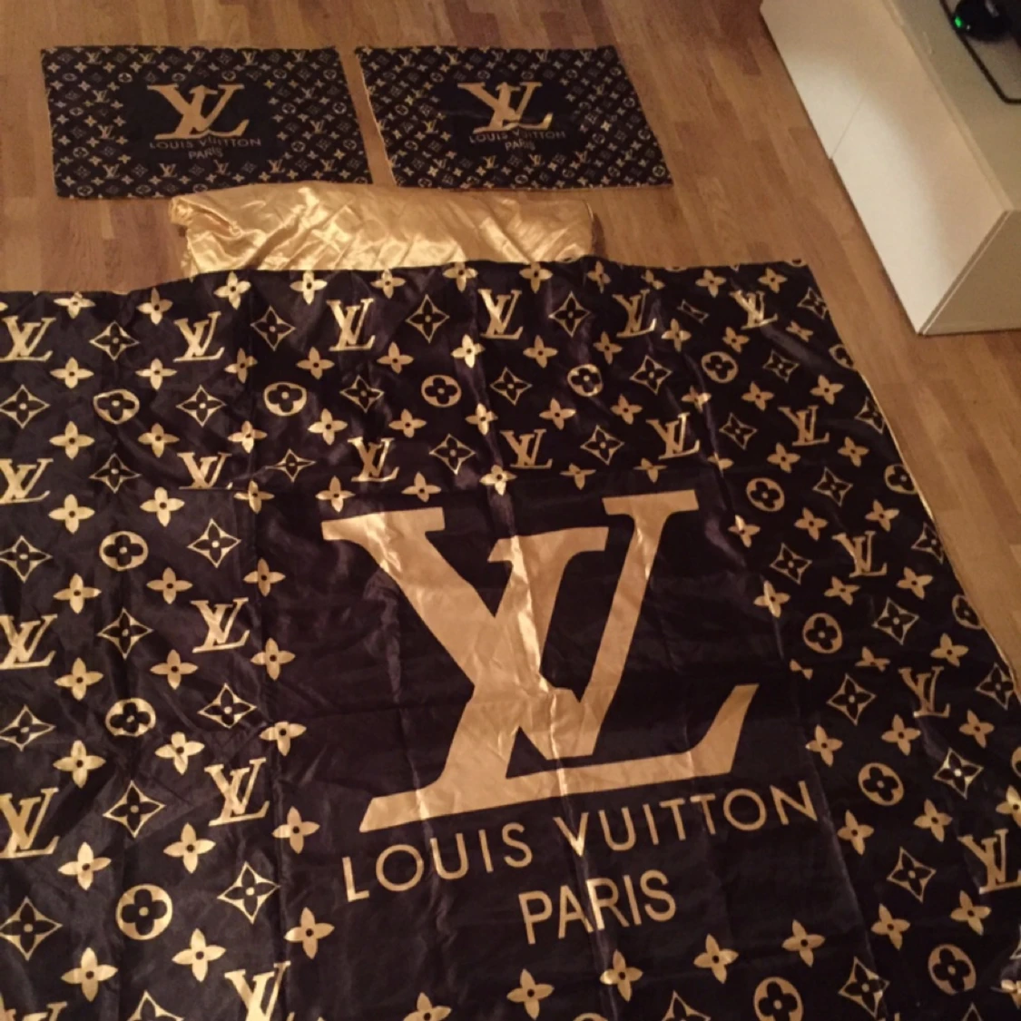 Louis Vuitton påslakanset för dubbelsäng. Två örngott, påslakan samt underlakan (i guldigt - ej mönster). Oanvänt men utan kartong. Dragkedja nedtill på påslakanet. Glansigt silkigt material.