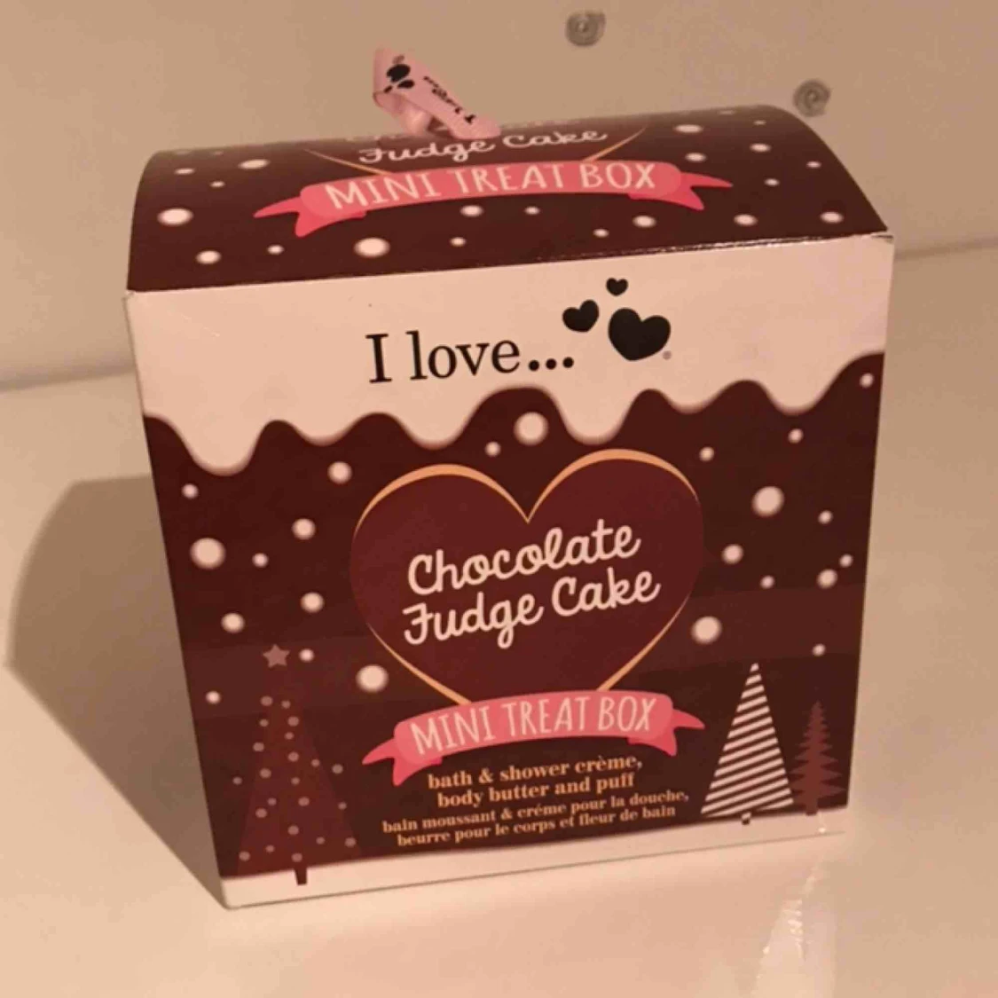 Ett helt nytt dusch set med en rosa puff att tvätta sig med och dusch tvål och kropps kräm i lukt av choklad fudge. Ett fint set att unna sig själv eller att ge bort!