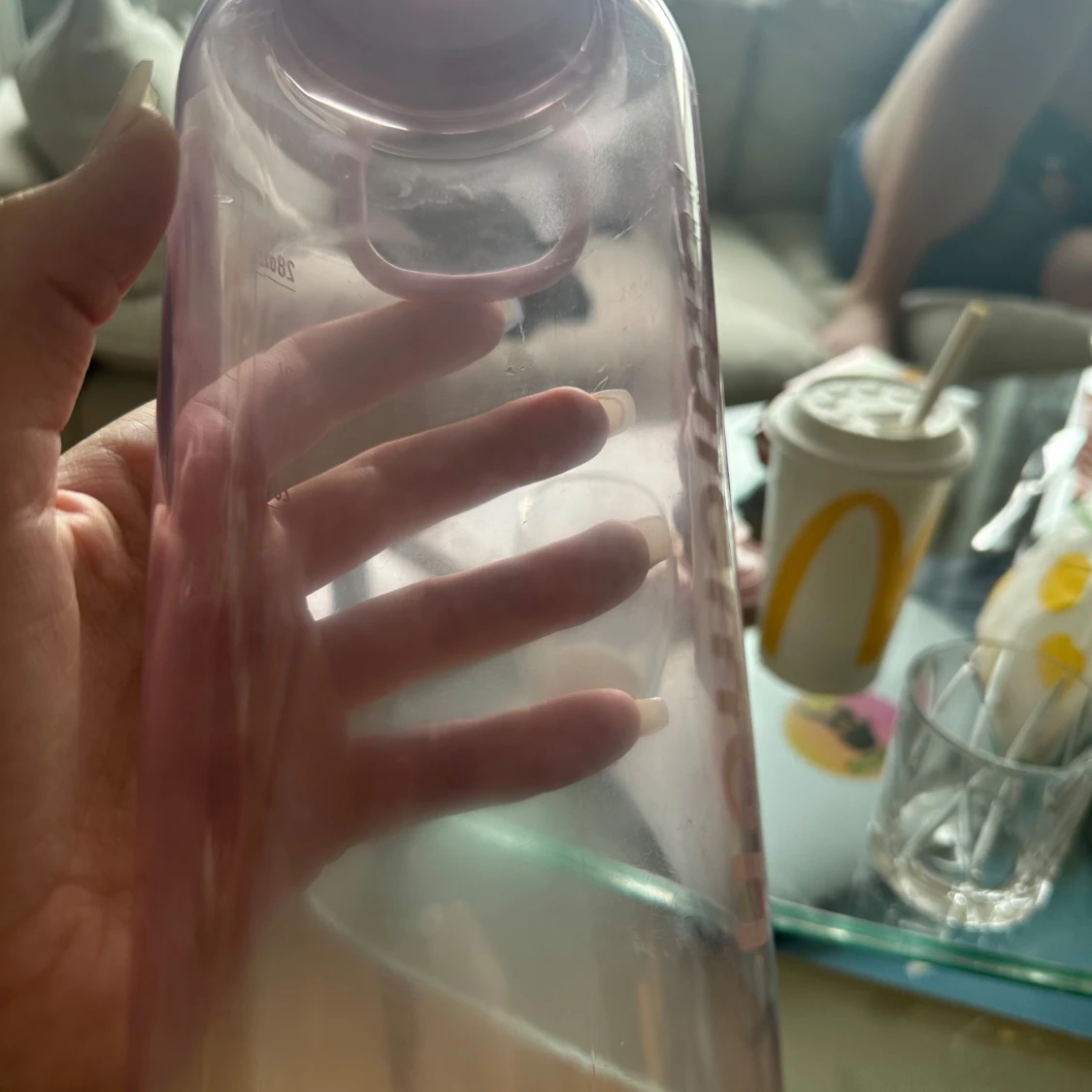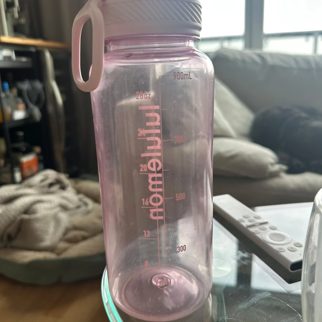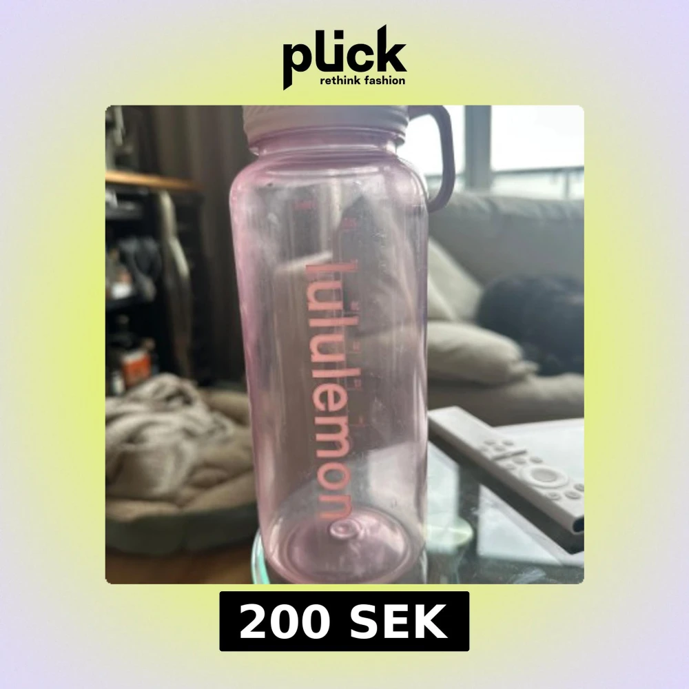 Rosa vattenflaska från Lululemon med 900 ml kapacitet. Flaskan har tydliga volymmärkningar och ett praktiskt bärhandtag. Den är använd men är i gott skick men finns tecken på slitage. Perfekt för träning, gym eller vardagsbruk.