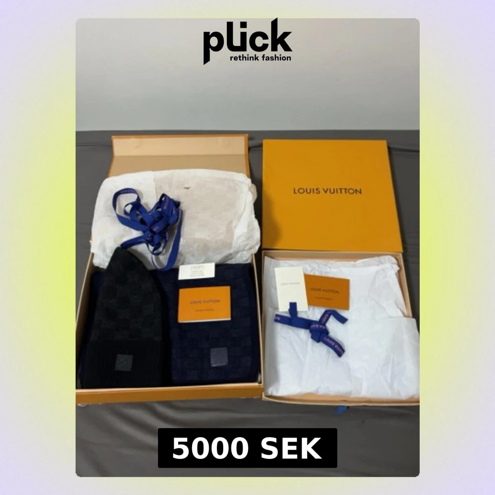 lv mössa och halsduk mössan är ny men halsduken lite använd men inga skador på den båda är äkta mössan har en egen box och mössan en egen box mössan är i svart färg och halsduken i mörkblå färg och båda är nya modellen på lv kommer med allt på bilden kan sälja separat och tar byten om jag gillar det och pris kan alltid diskuteras