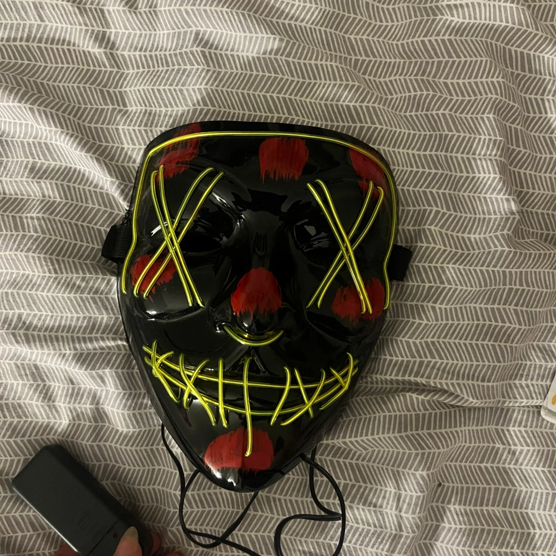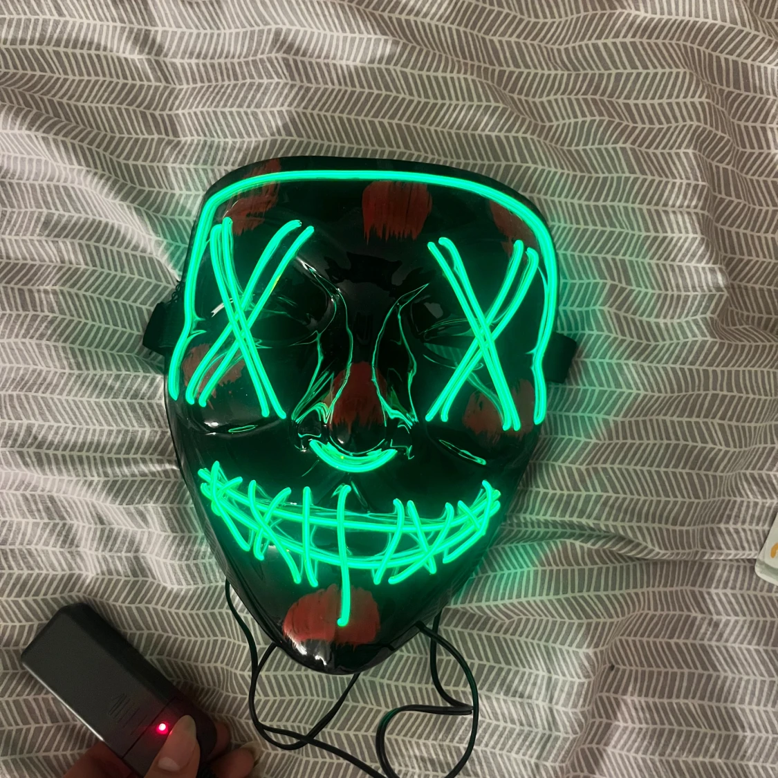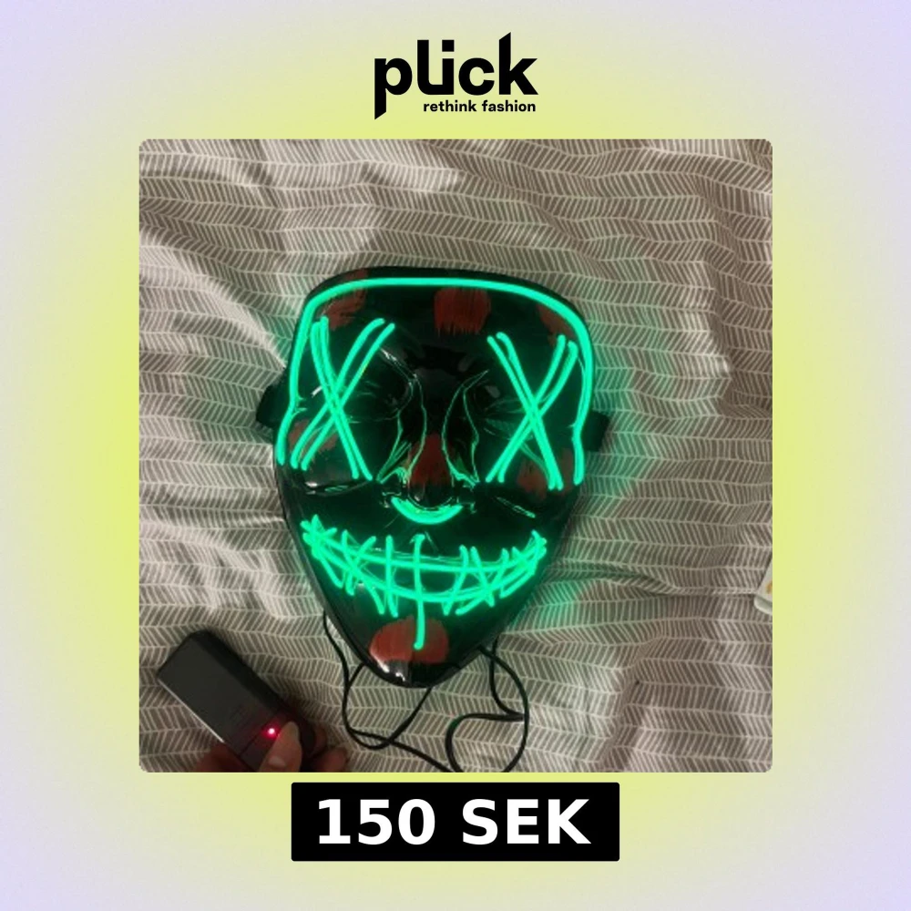 Unik LED-mask som lyser grönt, perfekt för fest, cosplay eller Halloween. Masken är i nytt skick och drivs av en batteridosa. Justerbart band för bekväm passform. Kan lysa hela tiden, blinka låmgsamt och även blinka snabbt💕