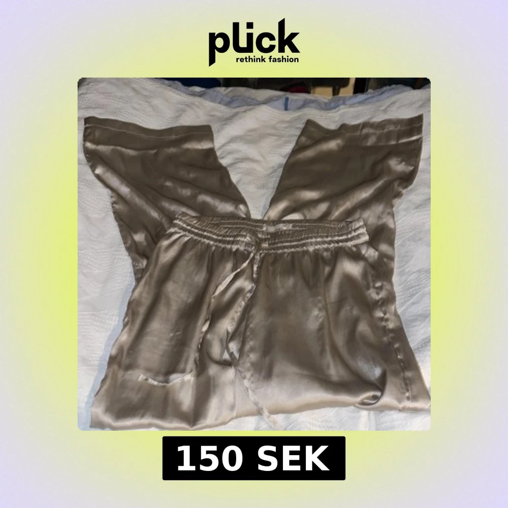 Säljer en beige pyjamas från Lager157 i polyester material med mjuk glansig finish. Byxan har knytband i midjan och en enkel, stilren design utan mönster. Perfekt för dig som gillar en clean look och vill ha något som känns lyxigt och bekvämt.