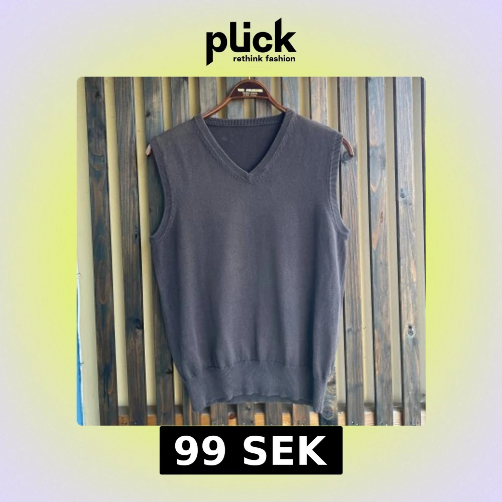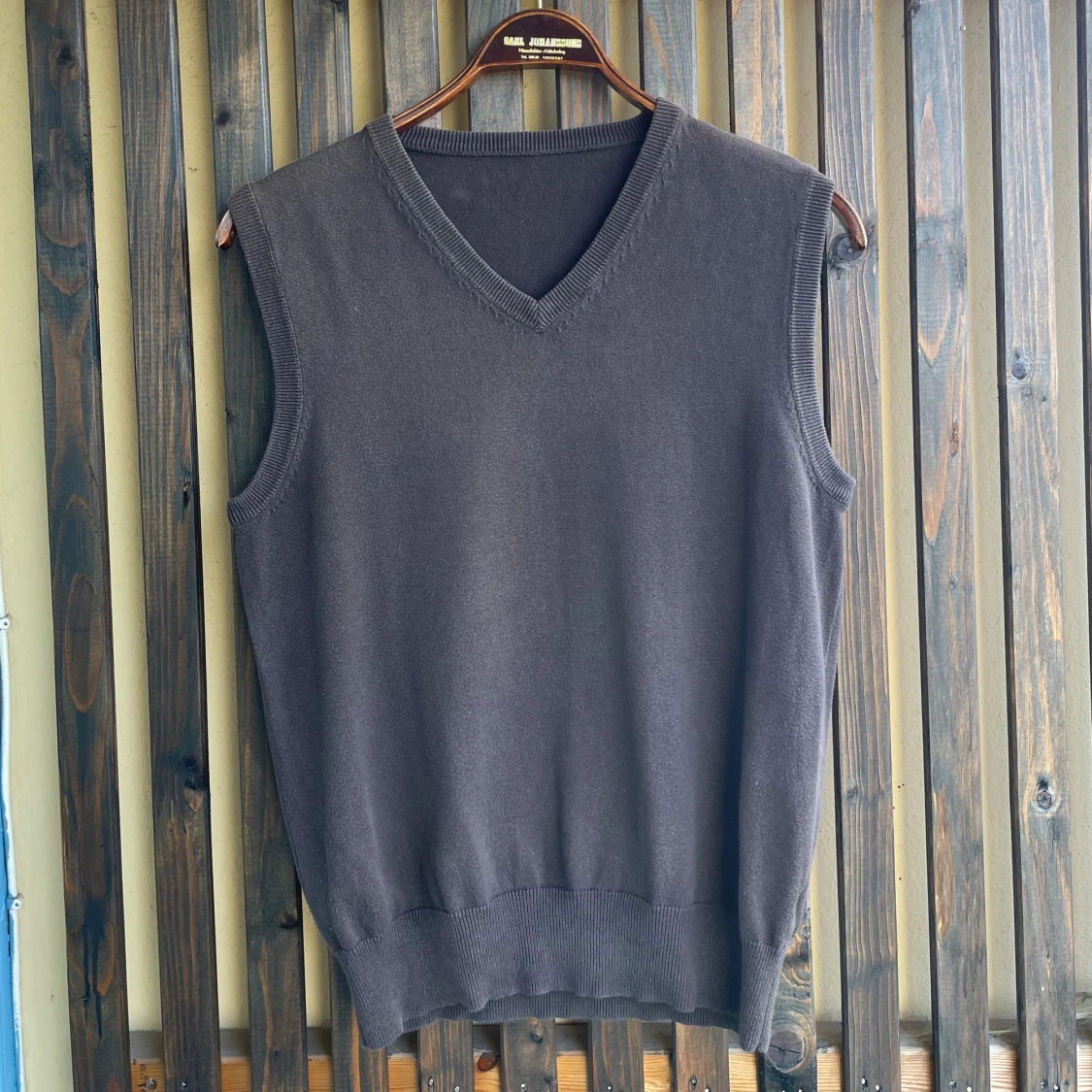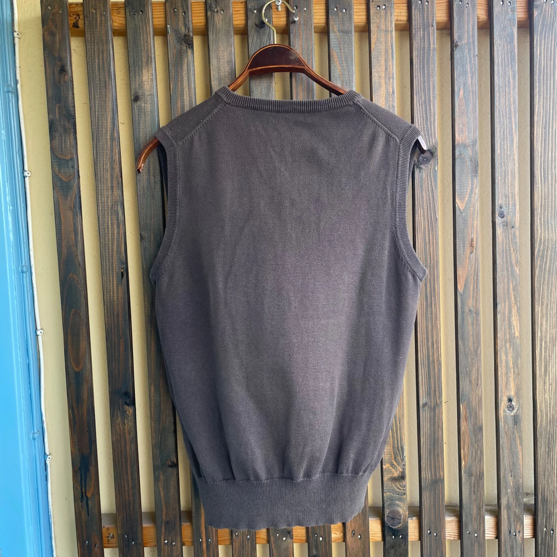 En stilren brun stickad väst med v-ringad hals och ribbade kanter. Perfekt att bära över en skjorta eller t-shirt för en clean look. Västen har en klassisk passform och är helt enfärgad utan mönster eller detaljer.