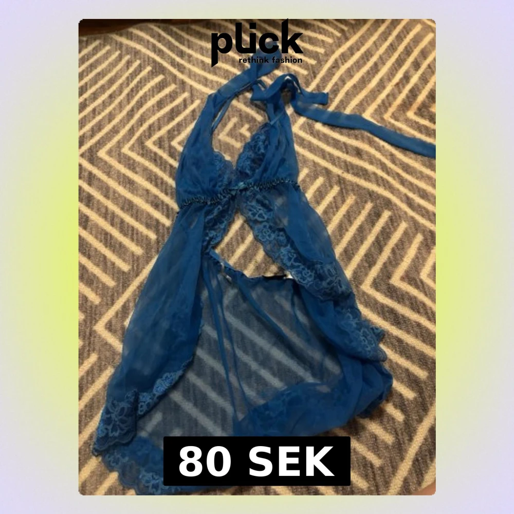 Säljer en blå väst i transparent syntetmaterial med spetsdetaljer längs kanterna och vid bysten. Västen har knytband i nacken och en öppen rygg.