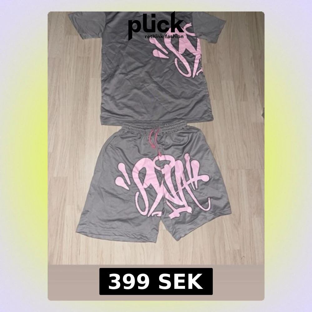 Säljer ett grått set med t-shirt och shorts i mjukt material. Båda delarna har stora rosa graffiti-inspirerade tryck framtill och baktill. Shortsen har resår och dragsko i midjan. Perfekt för dig som gillar streetwear och vill sticka ut med cool design.