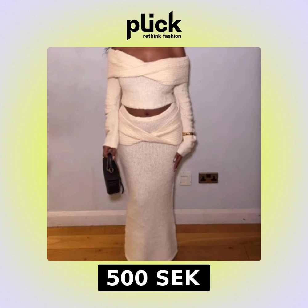 Snygg krämfärgad stickad klänning med offshoulder-design och omlott-detaljer. Klänningen har en lång passform. Den är både stilren och bekväm. Strechig i materialet. Helt oanvänt, med prislapp