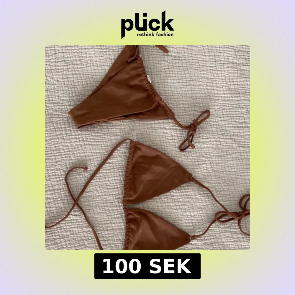Snygg brun bikini med trekantsöverdel och knytband i sidorna. Perfekt för soliga dagar på stranden. Enkel och stilren design som ger en naturlig look. Från märket Aqua Tropic. Trosan storlek M och toppen M.