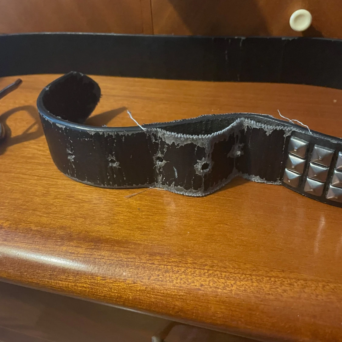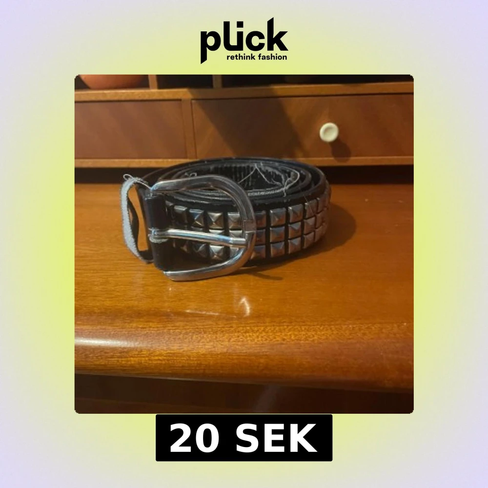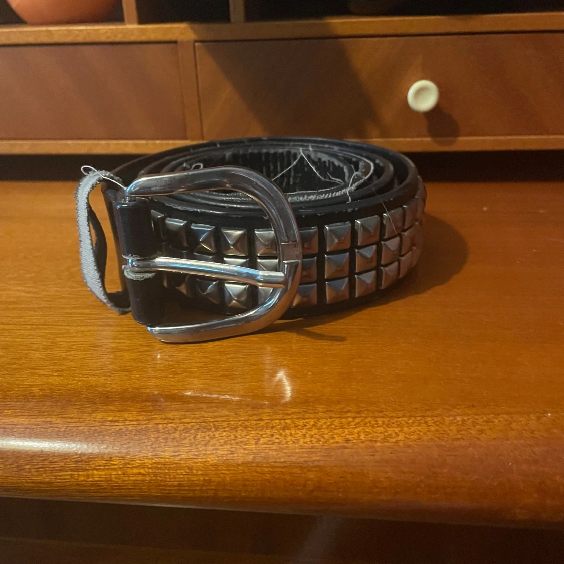 Säljer ett svart bälte med tre rader silverfärgade pyramidnitar och ett silverspänne. Bältet har en klassisk punkstil och passar perfekt till jeans eller kjol för en edgy look.