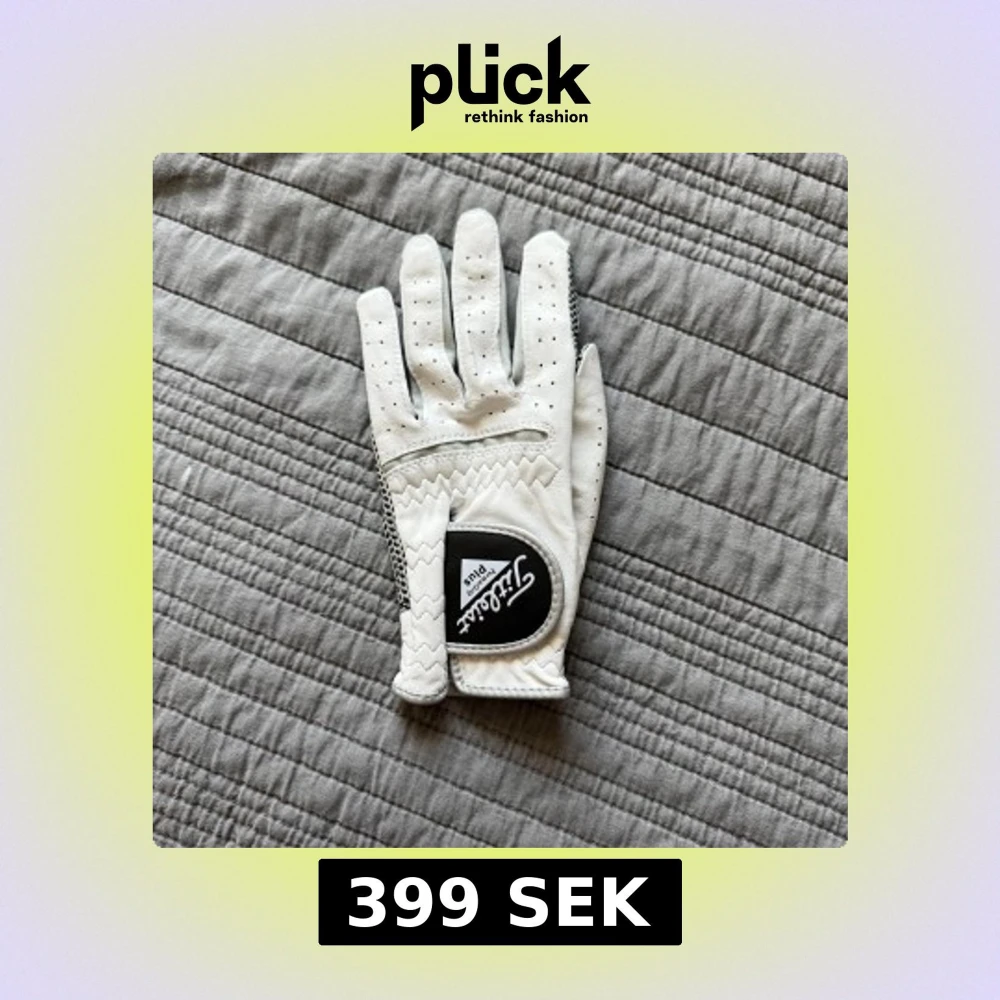 Säljer en snygg vit golfhandske från Titleist med svart detalj och prickigt mönster på insidan. Handsken har perforeringar för ventilation och är tillverkad i skinn med syntetmaterial på insidan för extra grepp. Perfekt för dig som vill ha stil på golfbanan.