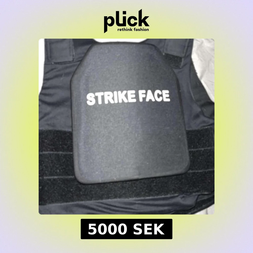 Säljer en svart skyddsväst med en solid platta märkt 'STRIKE FACE' och 'IV'. Västen har en robust design och är avsedd för säkerhet och skydd. Perfekt för aktiviteter som kräver extra skydd. 762, 9 mm och mer