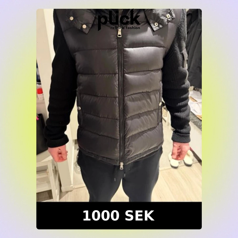 Säljer en svart dunväst med quiltad design och hel dragkedja framtill. Västen har hög krage med tryckknappar och två sidofickor. Perfekt att slänga över en hoodie eller tröja för extra värme.