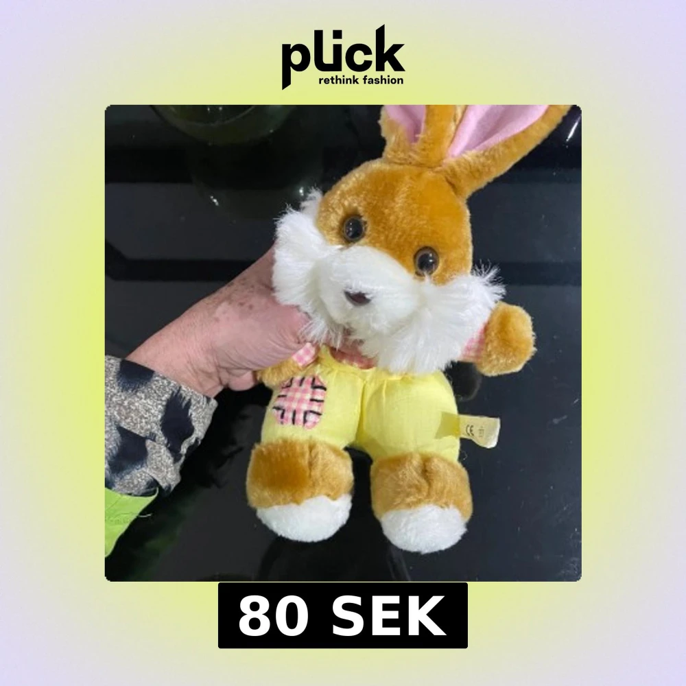 Söt mjukisdjur -kanin från MAGTOYS Swedberg AB, ca 30 cm lång. Kaninen har mjuk päls, stora ögon och är klädd i gula byxor med rosa-rutiga detaljer. Skicket är mycket gott, inga synliga defekter eller slitage. Perfekt som present eller samlarobjekt.