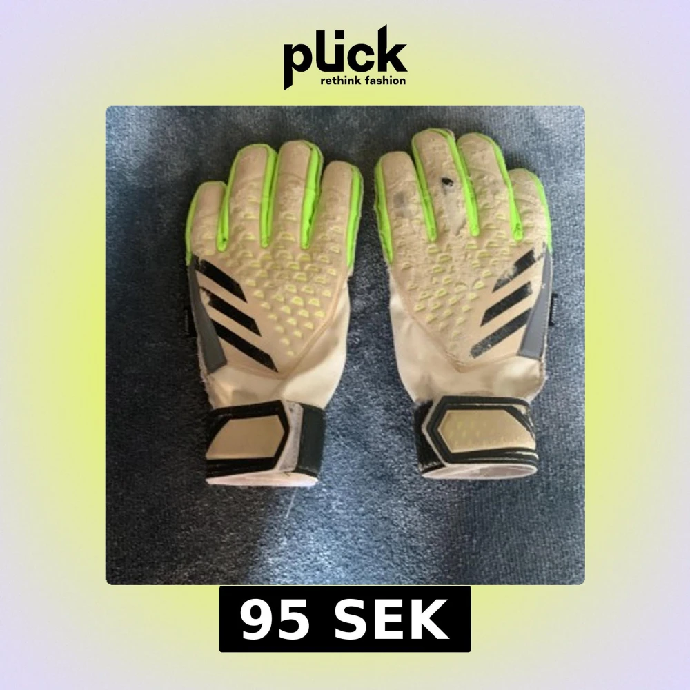 Säljer ett par Adidas Predator målvaktshandskar i beige och neongrönt med svarta detaljer. Handskarna har greppig yta på ovansidan, breda kardborreband vid handleden och klassiska Adidas-ränder. Perfekta för fotbollsmatcher och träning. Har även fingersavers.