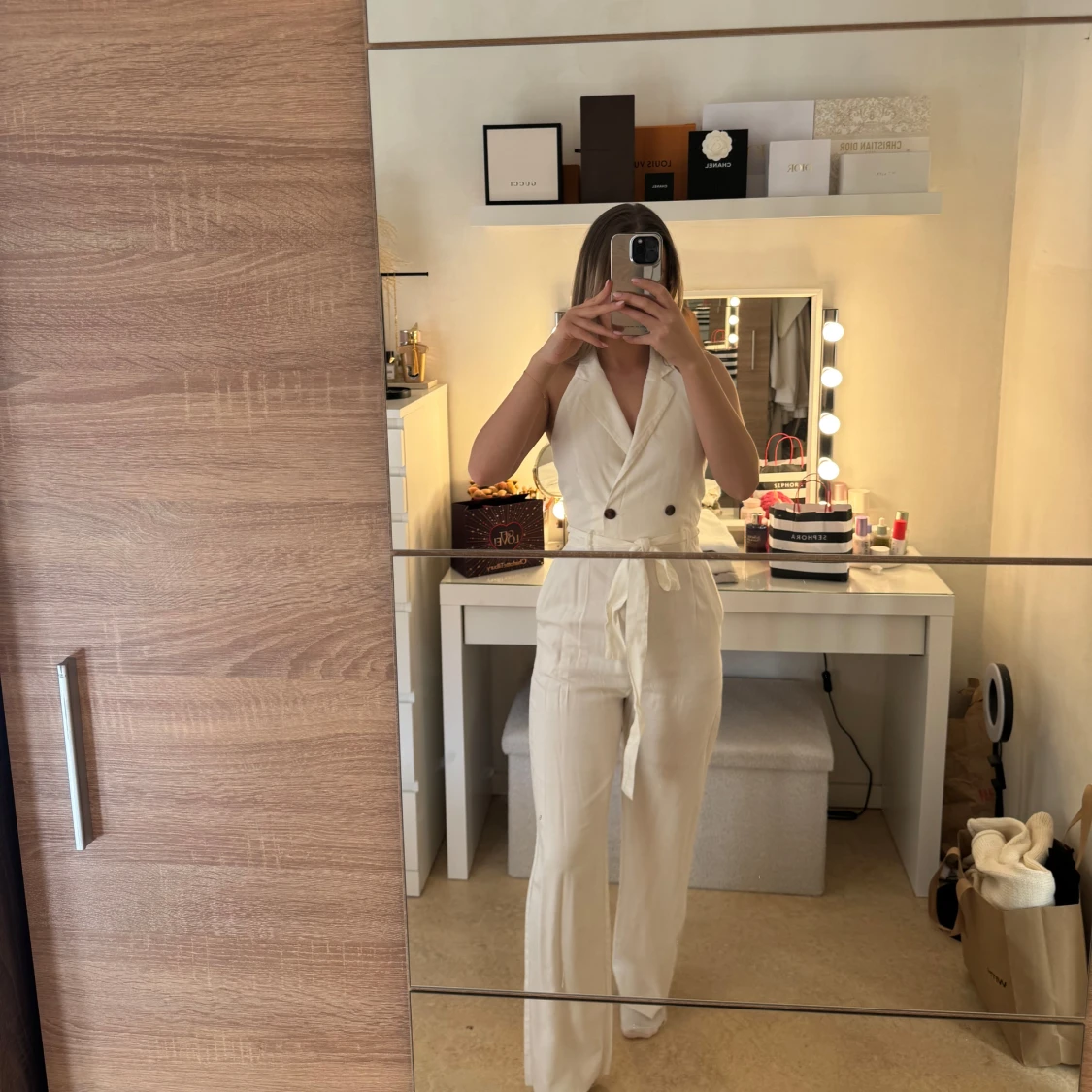 Säljer en stilren vit jumpsuit med knytband i midjan och dubbelknäppning framtill. Den är köpt från Mango och är i storlek S.