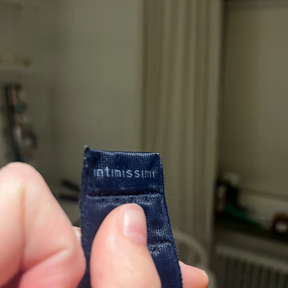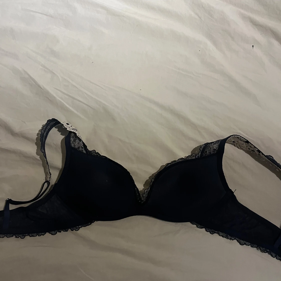 Snygg marinblå bh från Intimissimi med vacker vit spetsdetalj i blommigt mönster över kuporna och längs kanten. Justerbara axelband och elegant design som ger en lyxig känsla. Perfekt för dig som gillar stilrena underkläder med det lilla extra.