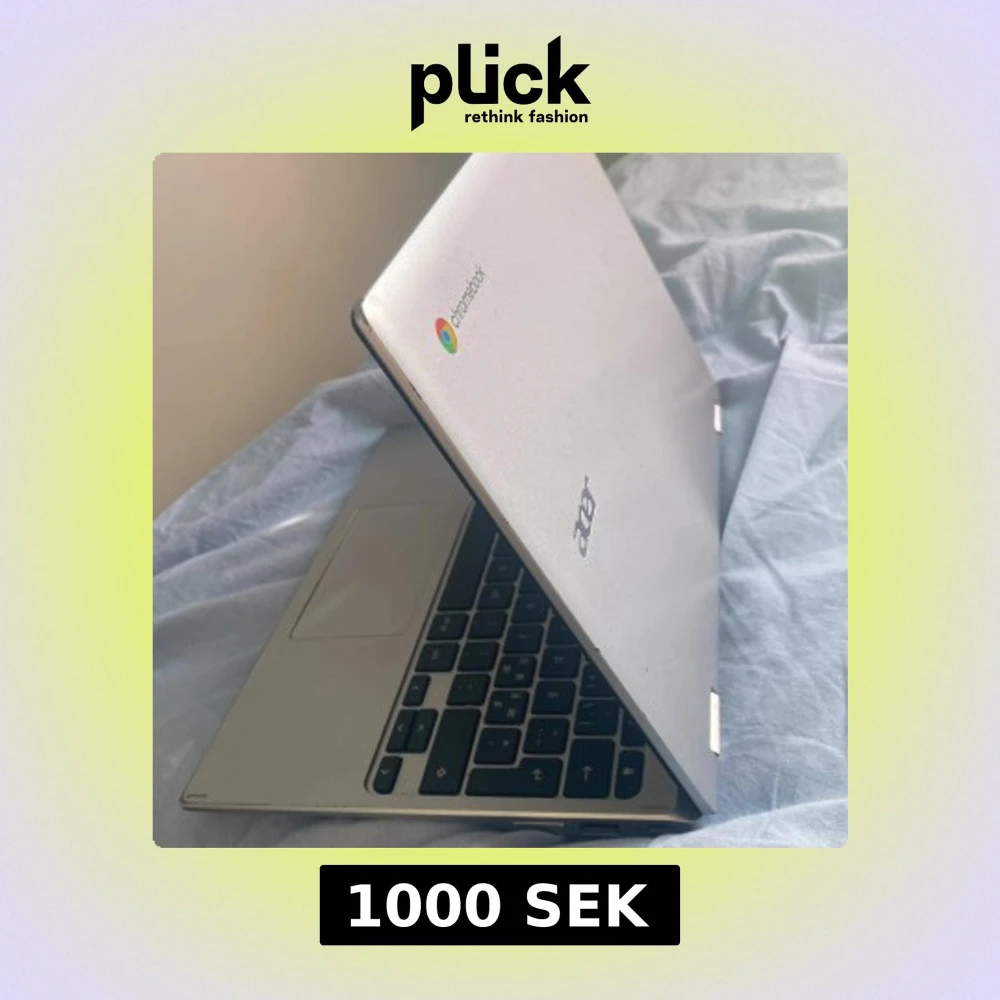 Kommer med laddare. Säljer en stilren Acer Chromebook i silver. Den har en smidig design med svart tangentbord och en stor pekplatta. Perfekt för studier eller arbete på språng. Lätt och enkel att bära med sig.