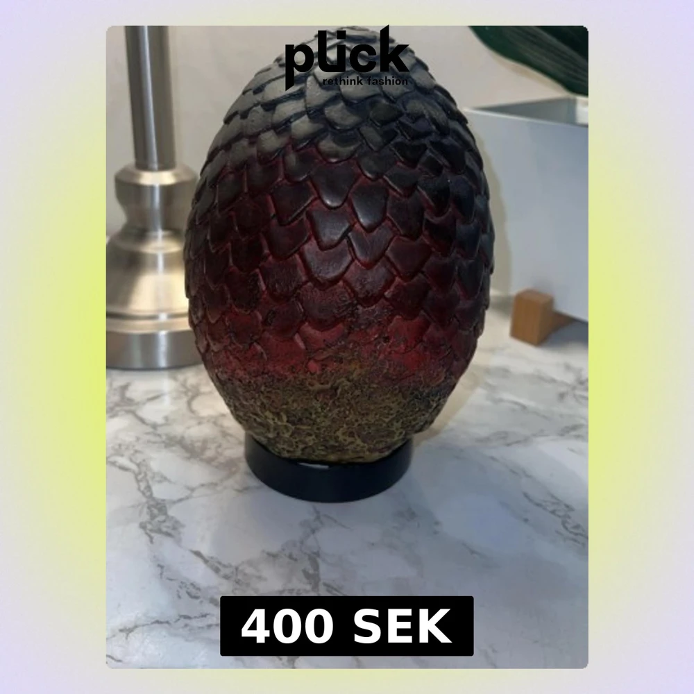Säljer en cool drakäggs-prydnad inspirerad av Game of Thrones. Ägget har en skrovlig yta med fjällmönster i svart och mörkrött, samt en grönaktig botten. Perfekt som dekoration för fantasyfans eller som unik inredningsdetalj.