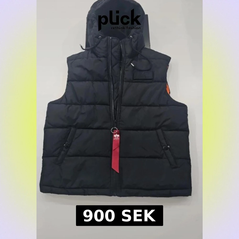 Säljer en svart dunväst från Alpha Industries med huva och orange innerfoder. Västen har två fickor med knappar, dragkedja framtill och en röd tag med logga. Perfekt för lager-på-lager och streetwear-vibe.