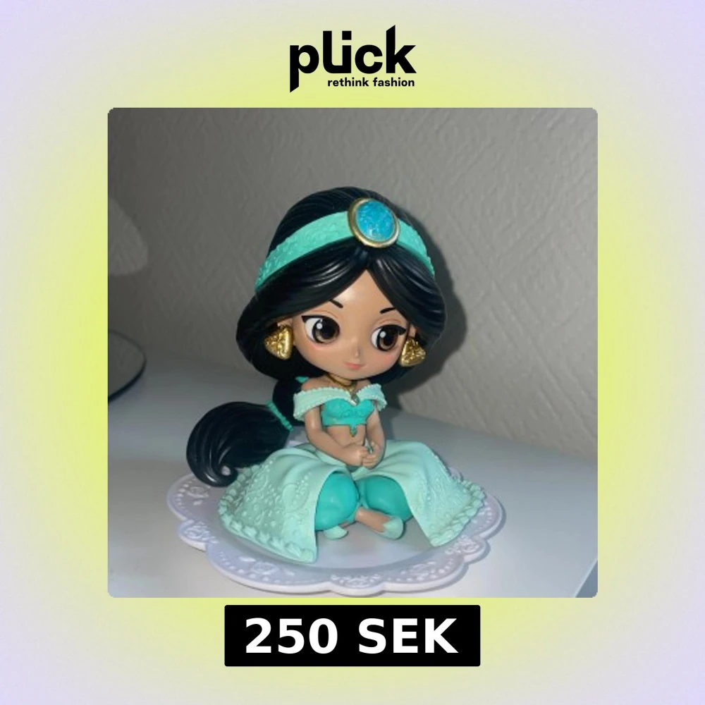 Bilderna visar en söt figur i turkos klänning och smycken, sittande på ett dekorativt fat. Figuren har långt svart hår med turkosa detaljer och guldörhängen. Perfekt för dig som gillar samlarprylar eller vill ha en cool dekoration till rummet.