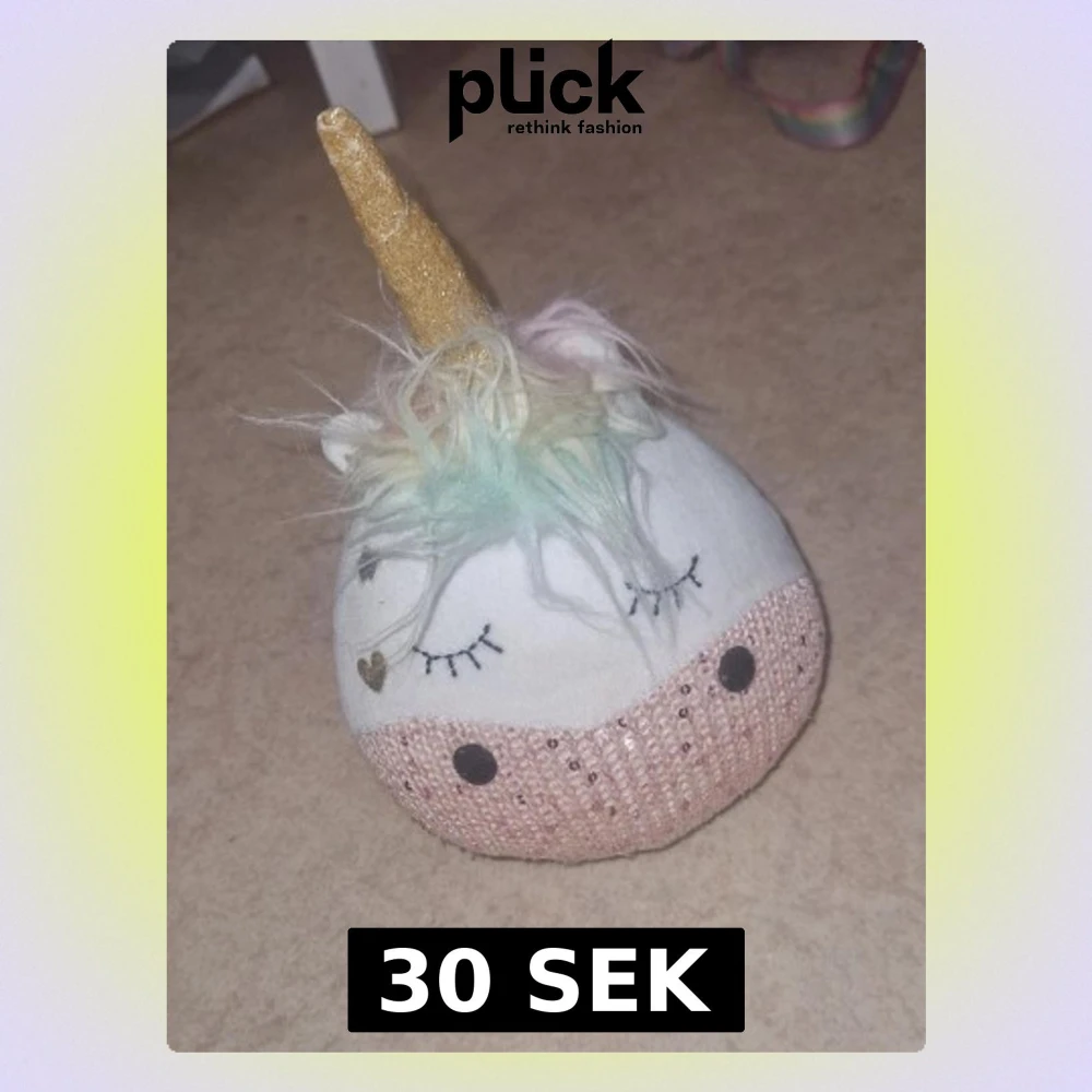 Söt rund mjukisdjur i form av en enhörning med ett glittrigt guldhorn, väger lite- dvs är inte lika lätt som ett vanligt mjukisdjur. Perfekt som dekoration eller gosedjur. Små fläckar finns men går nog att få bort. Inget som stör.