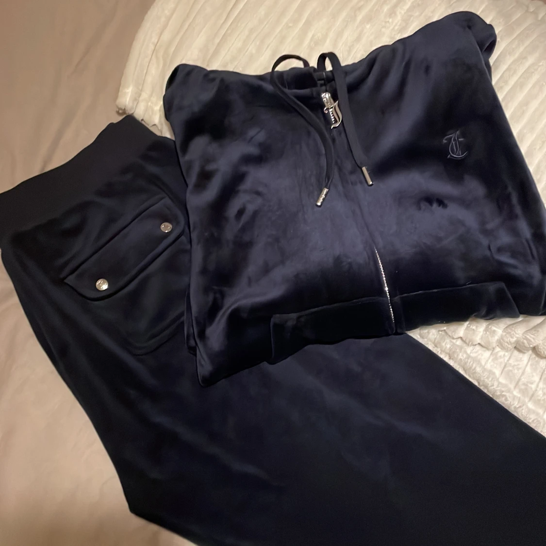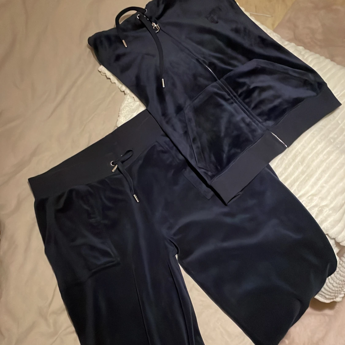 Jag säljer detta marin blåa juicy couture sett. Inte använd många gånger alls. I väldigt gott skick. Köpte för ca 2200kr. På tröjan är det storlek M och på byxorna är det storlek L.