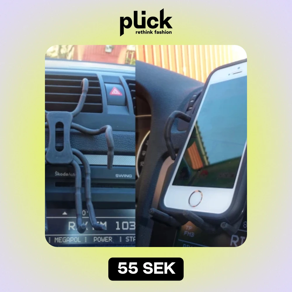 Passar för alla typer av telefoner, en eller två, GPS, mindre plattor mm. Formas enkelt efter dina behov och fästes i fläktgallret. Kräver inga verktyg och lämnar inga som helst märken på varken bilen eller tel.