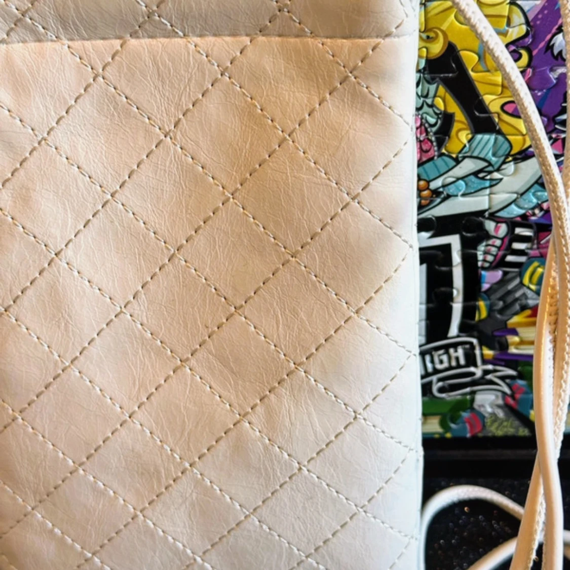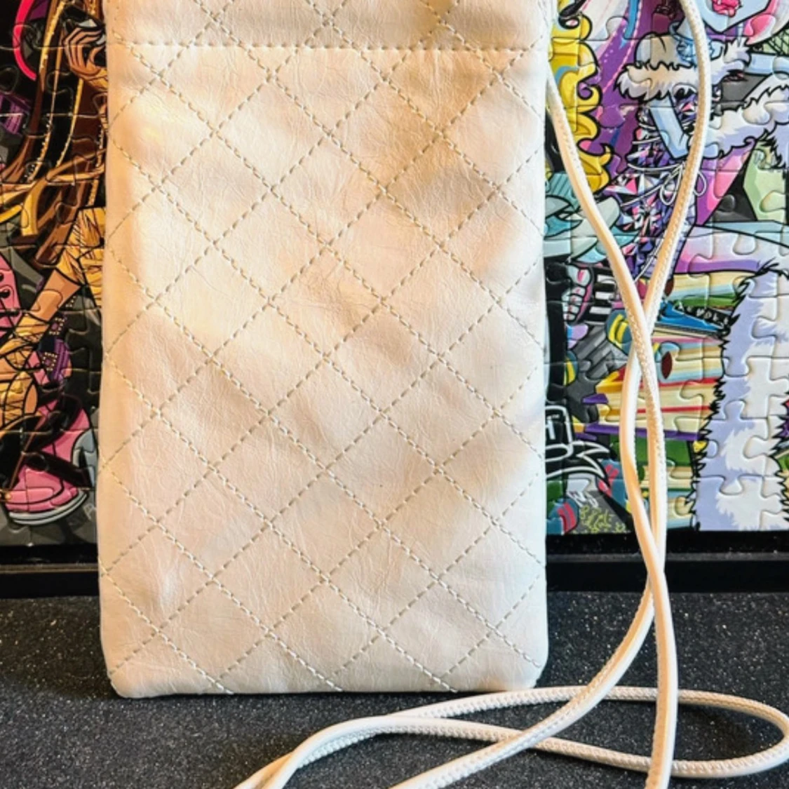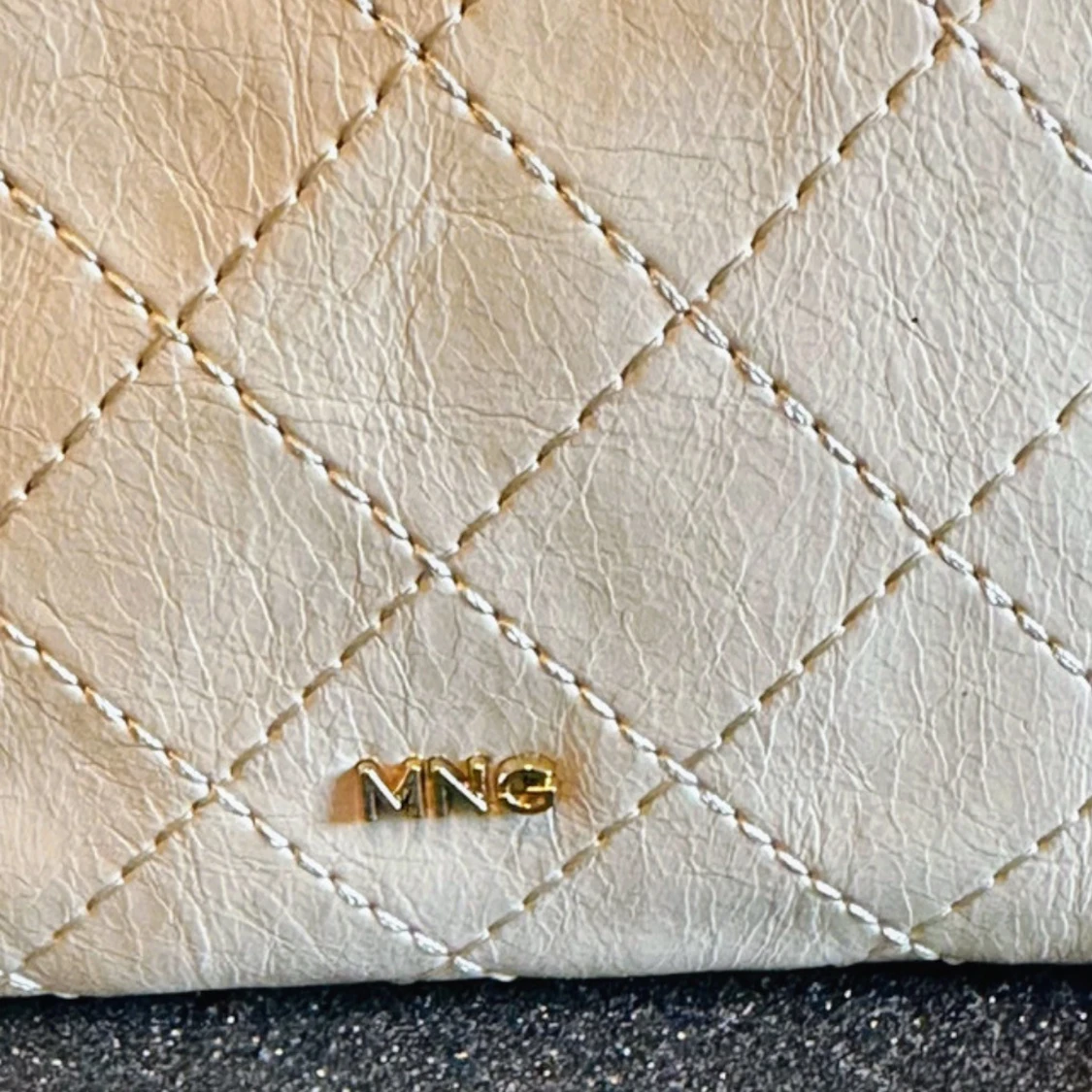 Snyggt benvitt mobilfodral med dekorativa sömmar, en guldfärgad Mango logga och ett långt justerbart handtag. Tryckknappsstängning. Innerfoder. Det är helt nytt och oanvänt i jättebra skick! 11.0x18.0x2.0 cm (Längd x Höjd x Bredd). Tillverkad i polyuretan med polyester innerfoder