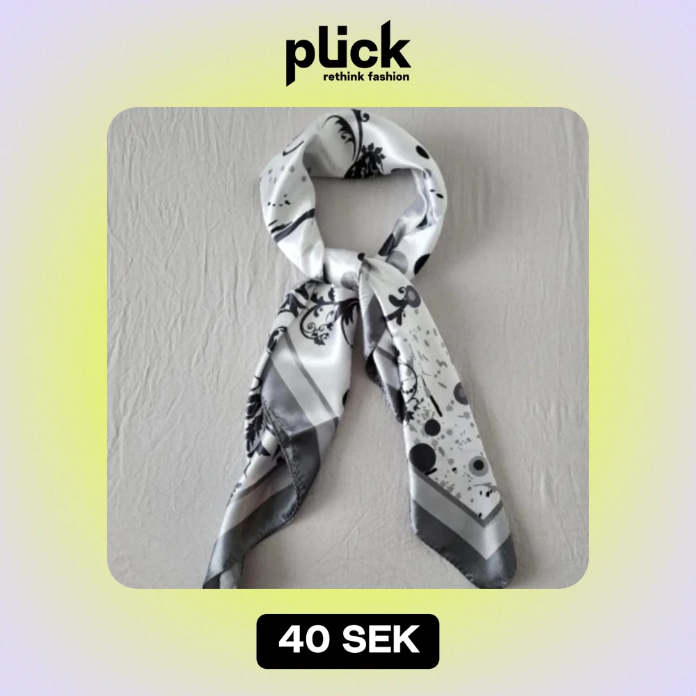 Grå/vit färgad sjal i siden. Antingen använd en gång eller aldrig använd, minns inte. Jättefin och skön material. Mått ca 92cm x 92cm.