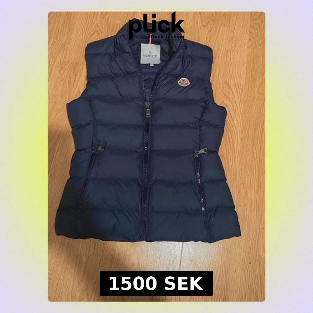 Snygg mörkblå dunväst från Moncler med quiltad design och hög krage. Västen har två praktiska fickor med dragkedja och ett klassiskt Moncler-märke på bröstet. Perfekt för lager-på-lager och har en stilren look med hel dragkedja framtill. Luvan saknas. Det står storlek 2 men den passar 152 cm