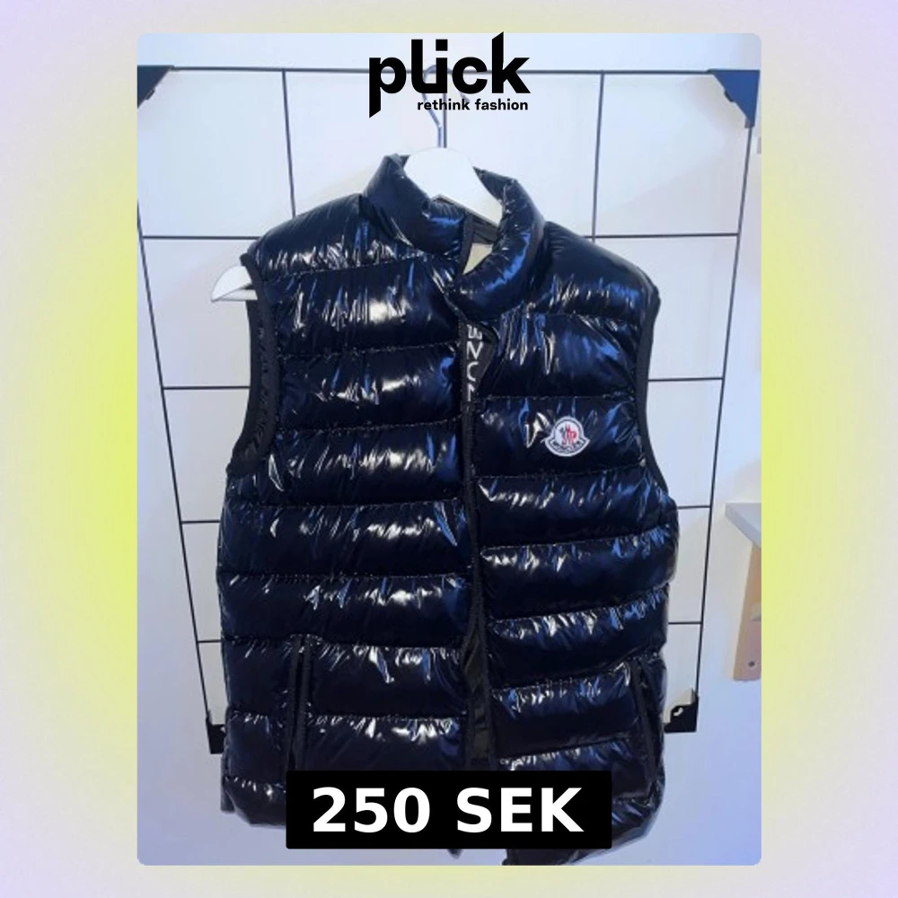 Snygg svart dunväst från Moncler med glansig finish och klassisk logga på bröstet. Västen har hög krage, två fickor med dragkedja och coolt Moncler-band vid öppningen. Insidan har ett unikt serietryck. Perfekt för lager-på-lager och streetstyle.