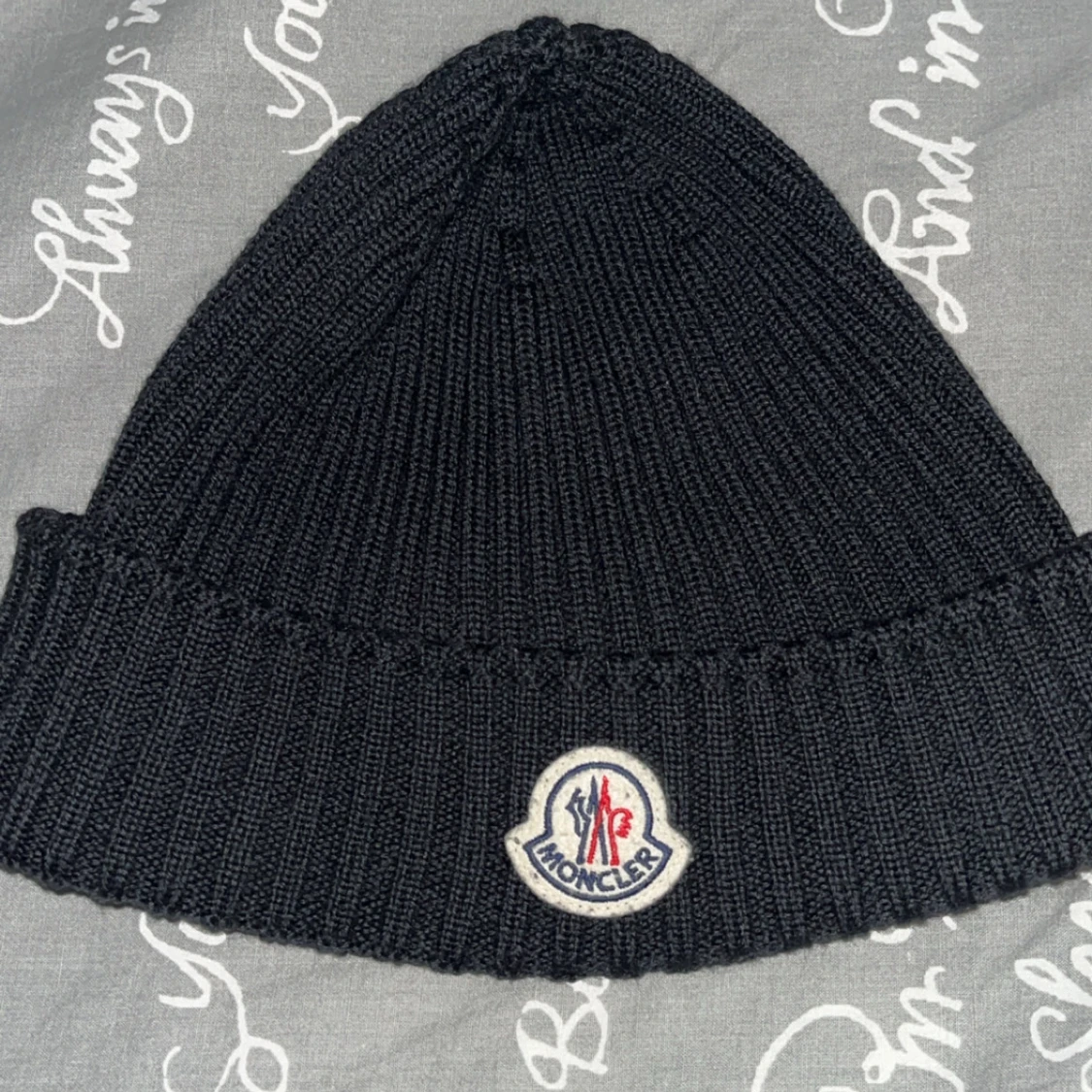 Svart ribbstickad mössa från Moncler med klassisk uppvikt kant och broderad logotyp framtill. Snygg och enkel design som passar till allt, tillverkad i mjukt ullmaterial för extra värme. Perfekt för dig som vill ha en clean look med exklusiv touch. ALLT ÄR ÄKTA SÅKLART Pris kan diskuteras vid sansbare affärer