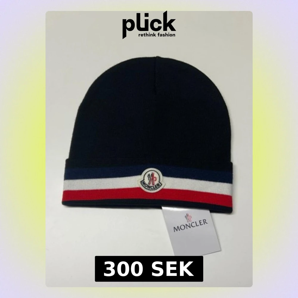 Svart Moncler mössa med ränder - Snygg svart ribbstickad mössa från Moncler med bred uppvikt kant och klassiska ränder i marinblått, vitt och rött. Märkets logga sitter framtill på kanten. Perfekt accessoar för att hålla värmen och addera lite lyx till din look.