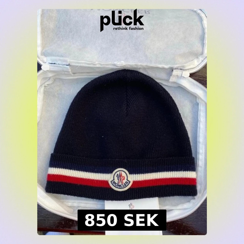 Bilden visar en stickad mössa från Moncler i mörkblått med röd och vit rand samt Moncler-loggan. Fick en i grå som gillar, så vill sälja denna