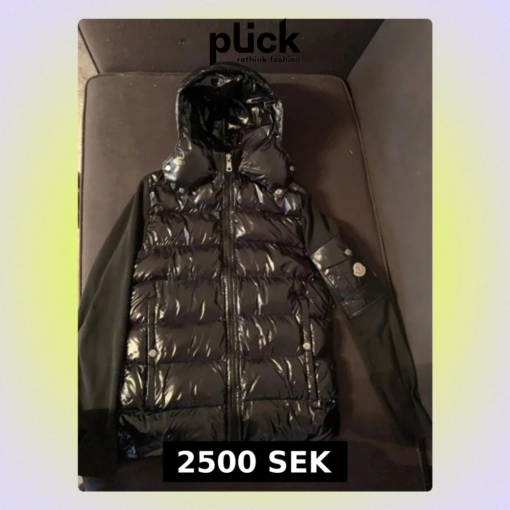 Säljer en svart dunväst från Moncler med glansig yta och avtagbar huva. Västen har dragkedja framtill, två fickor med tryckknappar och ett Moncler-märke på ärmen. Materialet är polyester och dun, med stickade partier på sidorna och ryggen för extra komfort.