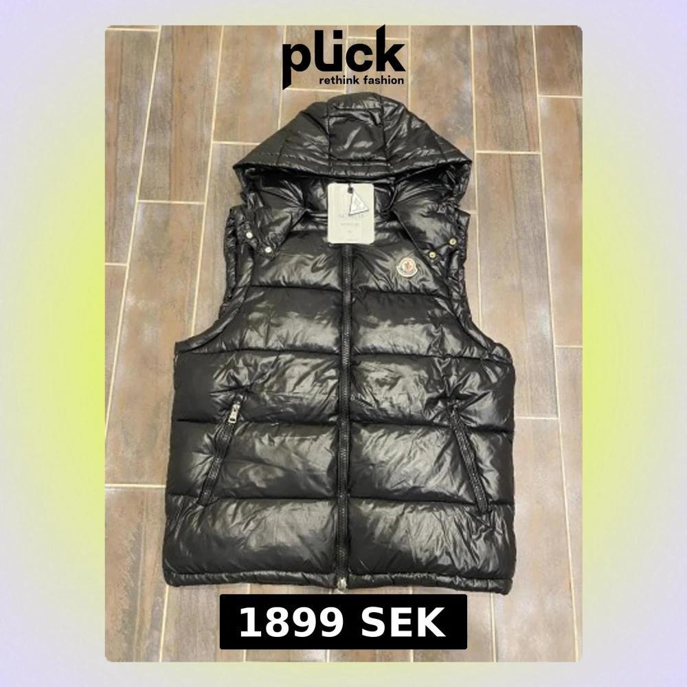 Svart dunväst från Moncler med avtagbar huva och klassisk logotyp på bröstet. Västen har quiltad design, två fickor med dragkedja och snygga guldfärgade tryckknappar vid axlarna. Insidan har ett coolt serietidningsmotiv. Perfekt för lager-på-lager under höst och vinter. NFC funkar.