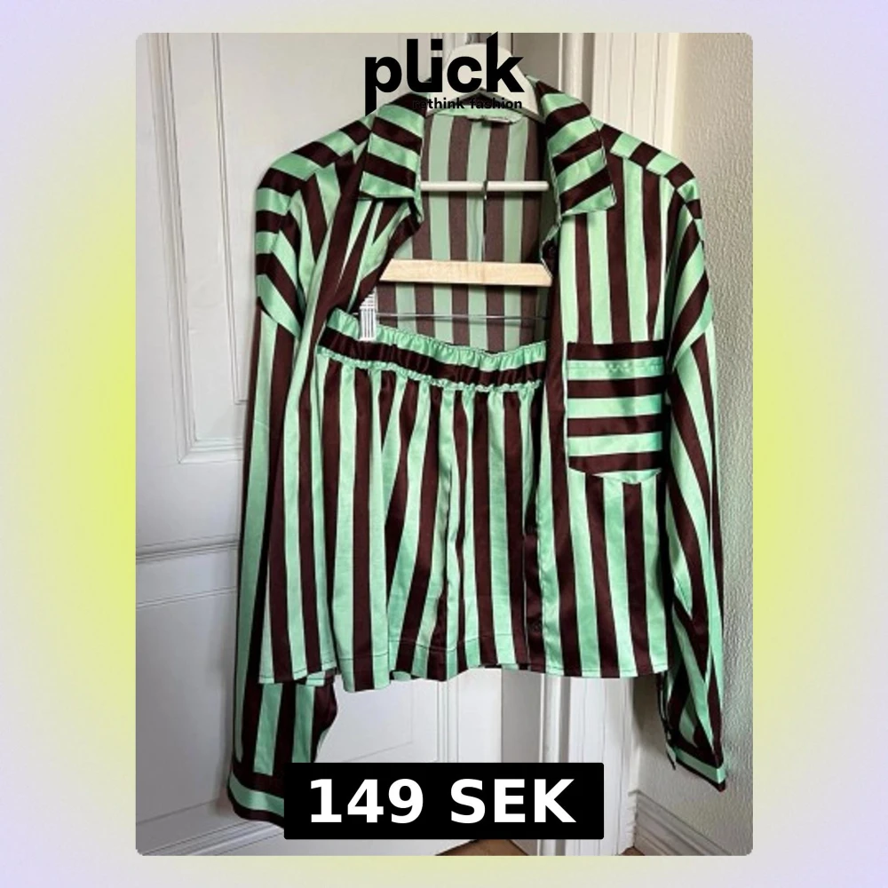 Skjorta och kort byxa med resår i satin från Monki. Breda vertikala ränder i mintgrönt och mörkbrunt. Kan användas som pyjamas eller på dagen varje plagg för sig eller i set för en coolt dressad look. Fräsch, obetydligt använd.