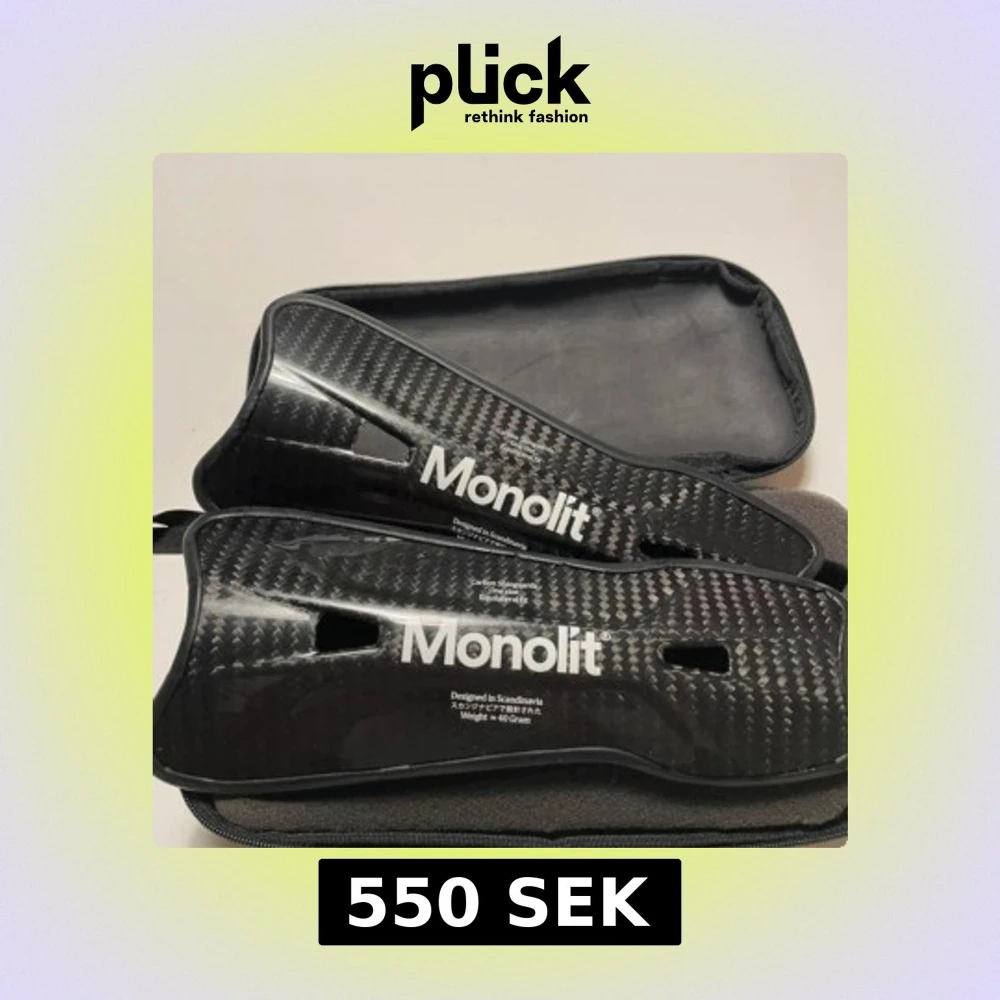 Säljer ett par svarta benskydd från Monolit i kolfiber med snyggt mönster och vit logga. De är lätta, har en ergonomisk form och kommer i ett smidigt fodral. Perfekta för dig som vill ha riktigt schyssta skydd på planen.
