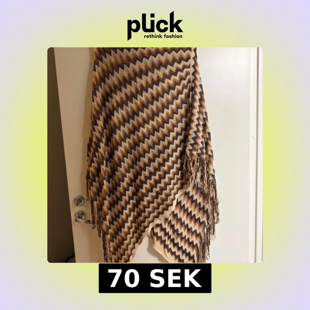 Snygg halsduk med zigzag-mönster i beige, brun och svart. Den har fransar längs kanterna och är perfekt för att ge en bohemisk touch till din outfit. Passar bra till kyligare dagar.