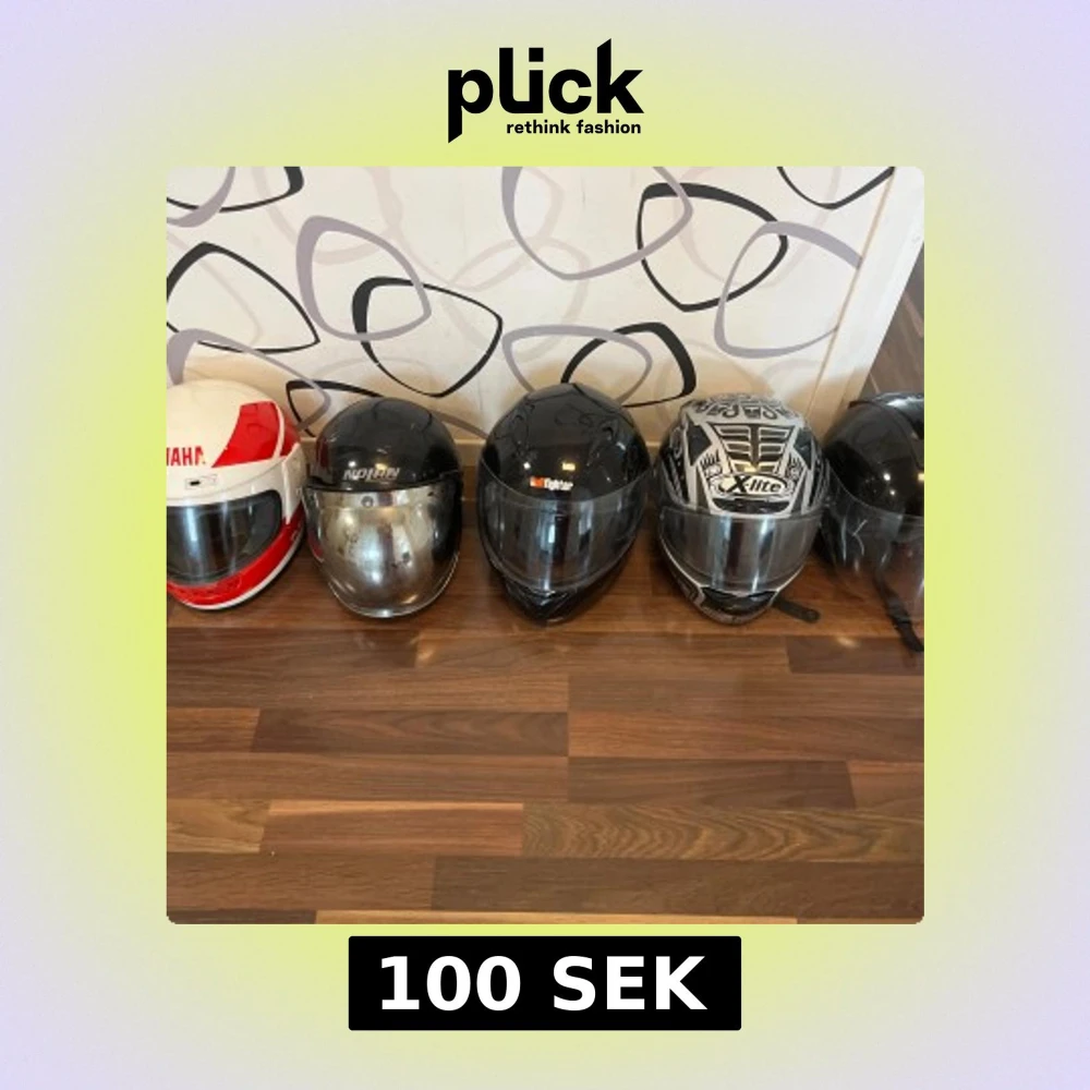Fem coola hjälmar i olika stilar och färger. En vit och röd Yamaha, en svart Nolan, en svart Bullfighter, en svart och silvermönstrad X-lite samt en svart hjälm. Alla har visir och aerodynamisk form, perfekta för MC-åkning. Skriv för fler bilder på specifika hjälmar och storlekar! Hjälmarna är i olika skick så fråga bara på! Pris kan diskutera och varierar från hjälm till hjälm. 100-300kr