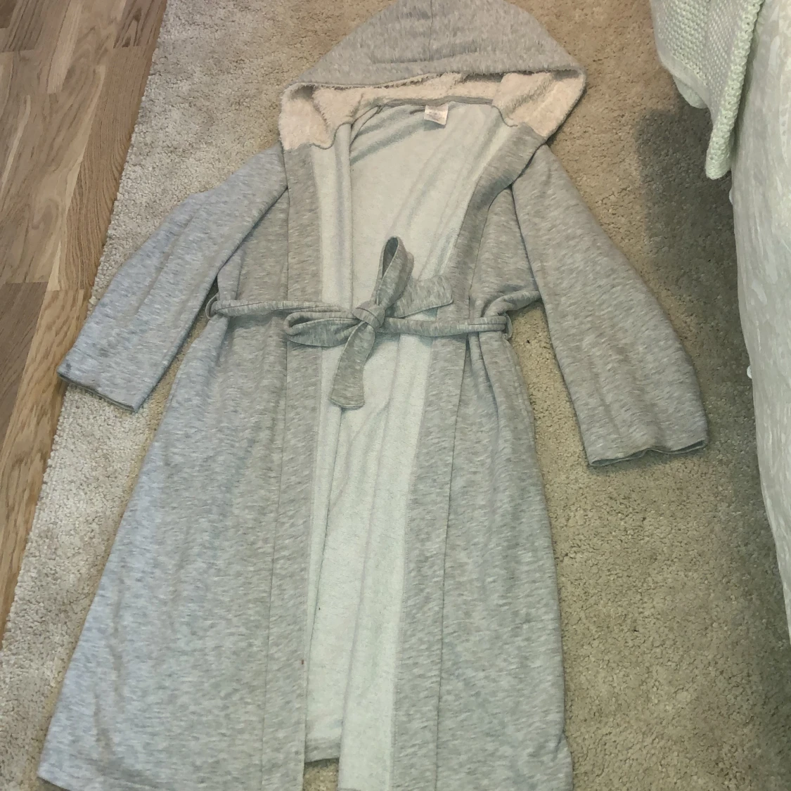 En grå morgonrock med två fickor och en fluffig luva, Ärmarna är lite korta.
