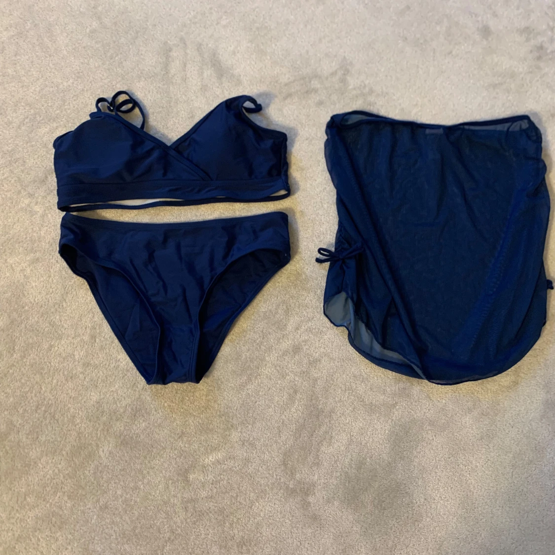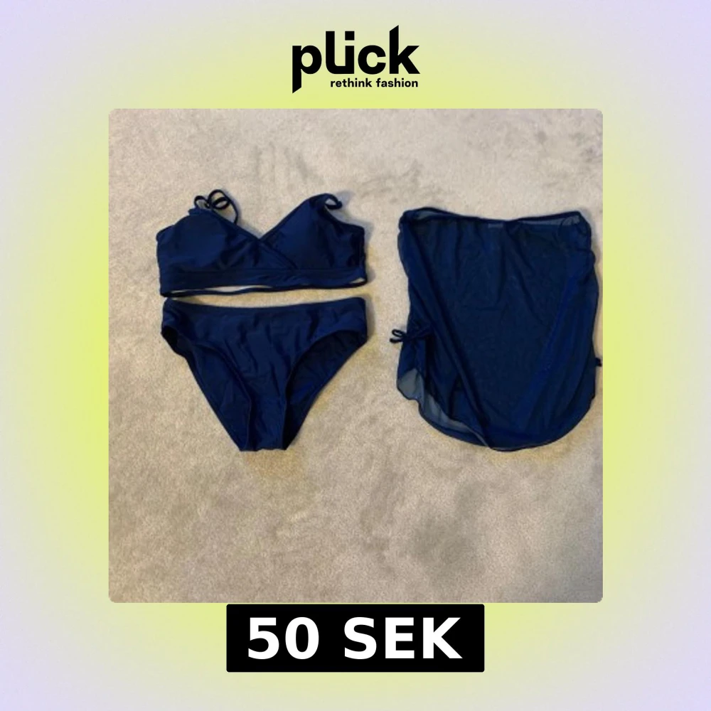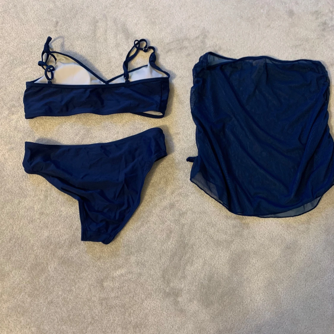 Snygg mörkblå bikini med omlott-topp och matchande underdel. Setet inkluderar även en lätt kjol i samma färg. Perfekt för en dag på stranden eller vid poolen. Toppen har knytband för justerbar passform.
