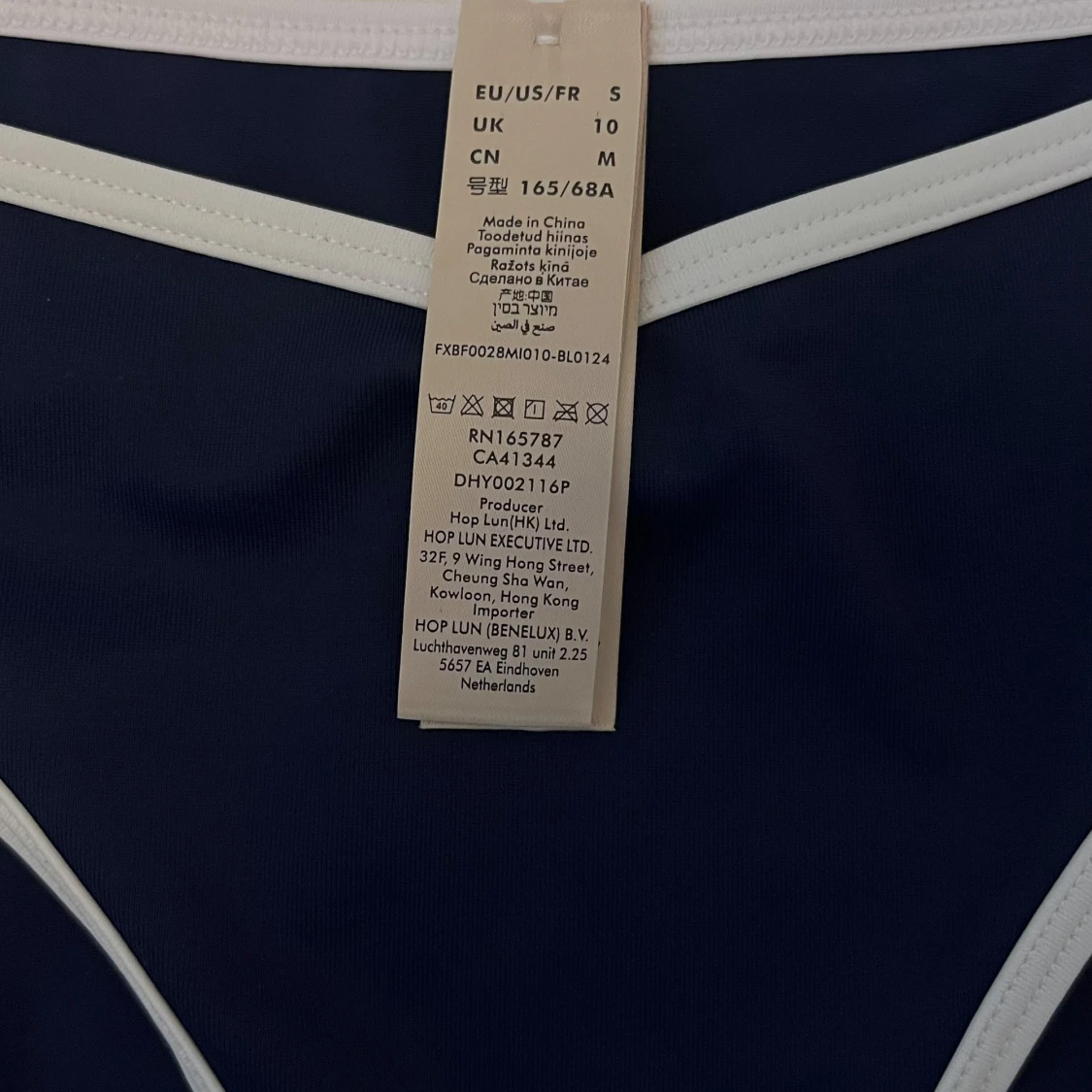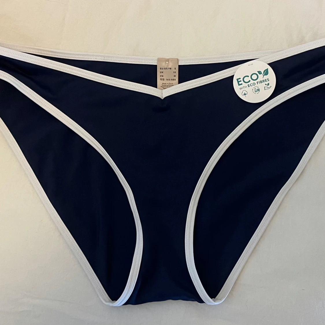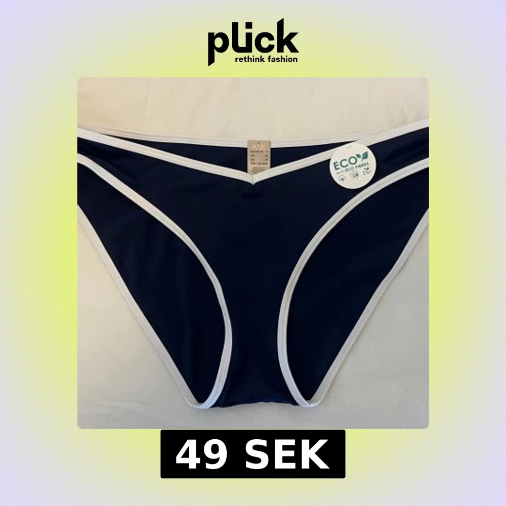 Snygg mörkblå bikiniunderdel med kontrasterande vita kanter. Tyvärr för små för mig. Aldrig använda.
