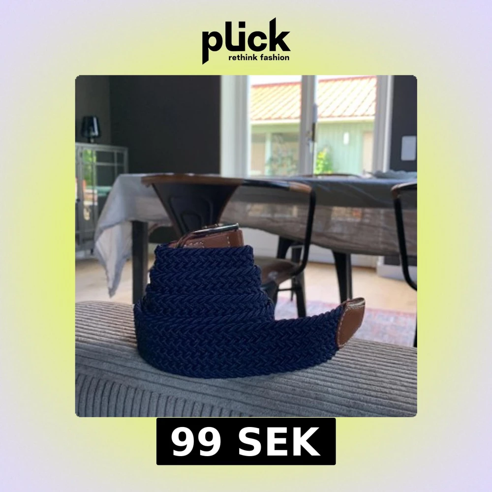 Säljer ett mörkblått flätat bälte med bruna skinn-detaljer vid spännet och ändarna. Bältet har ett silverfärgat spänne och passar perfekt till jeans eller chinos. Snygg och stilren accessoar för att lyfta din outfit.