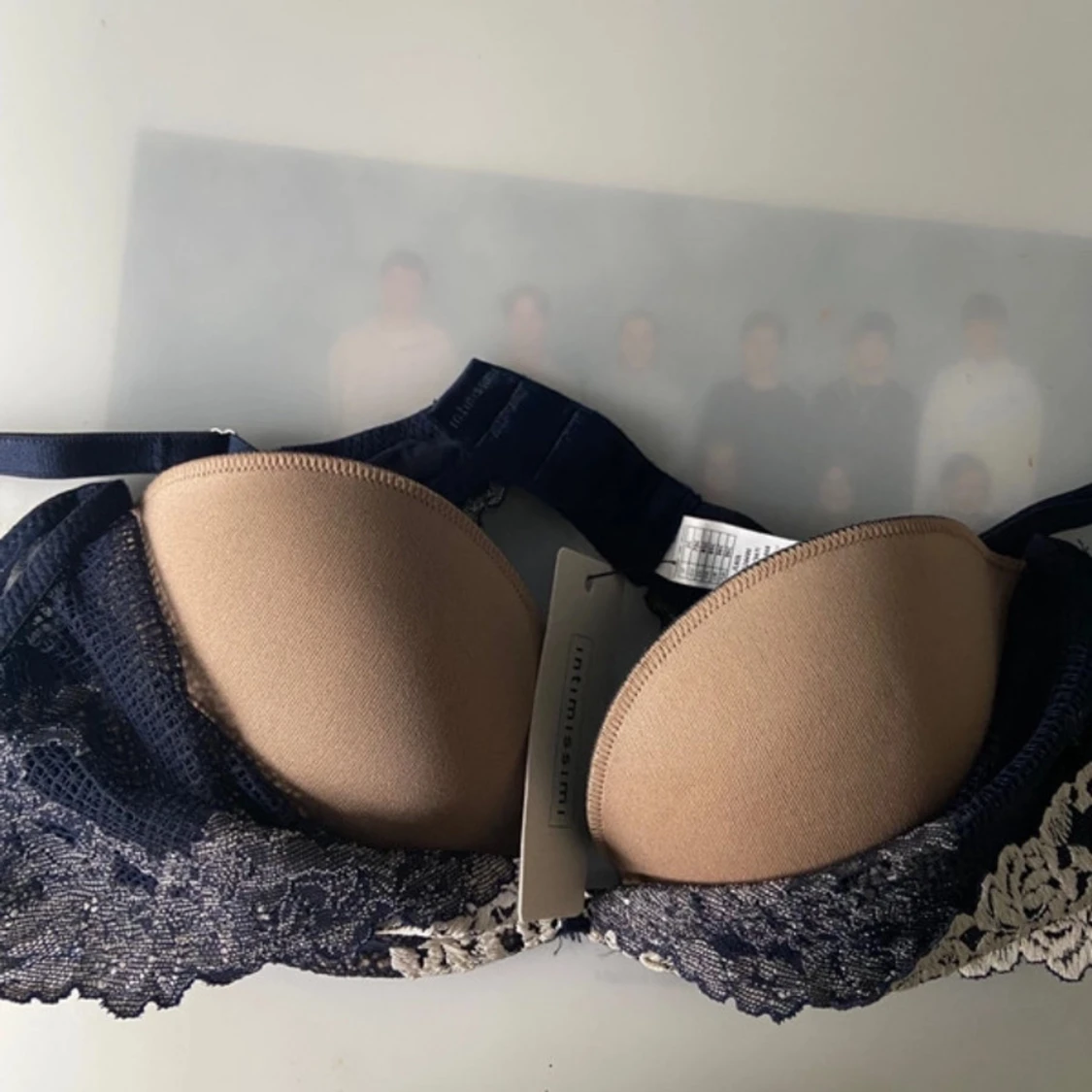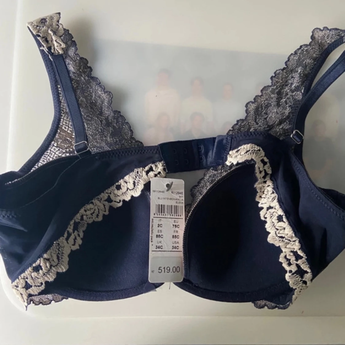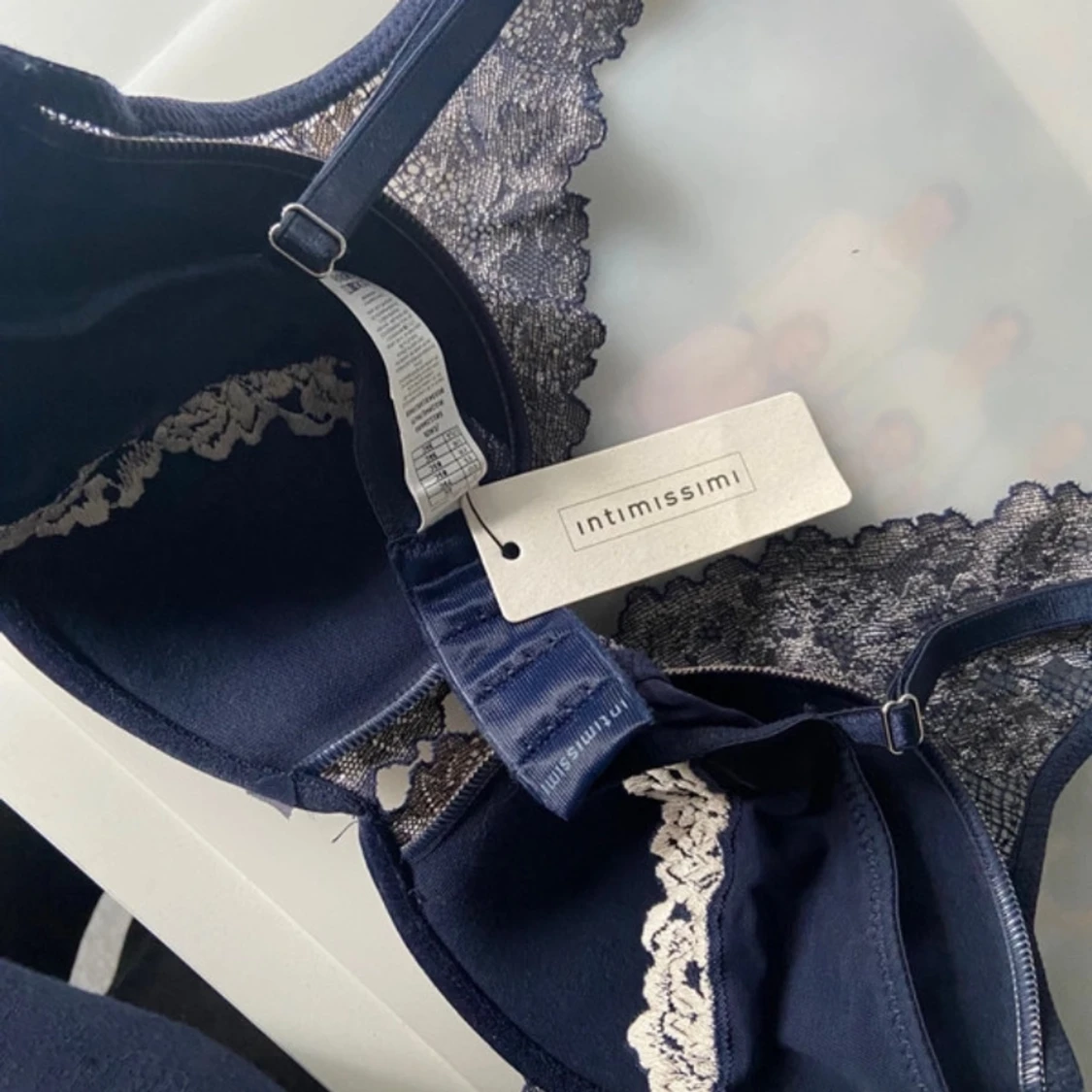 Säljer en mörkblå bh från Intimissimi . Bh:n har justerbara axelband och elegant mönster framtill och baktill. Perfekt för dig som vill ha något både snyggt och bekvämt. Helt nya