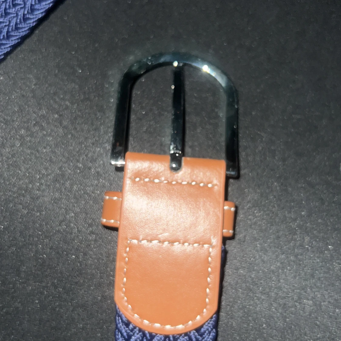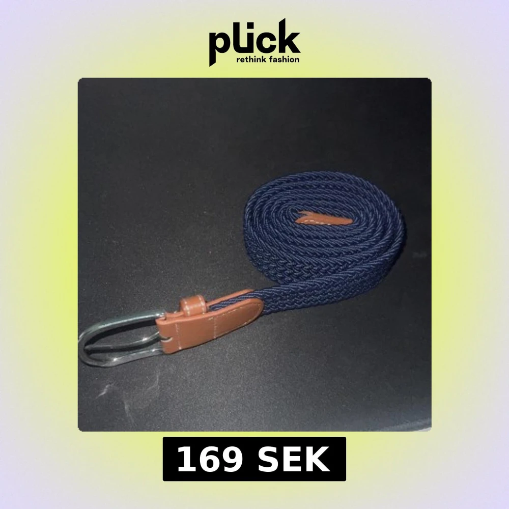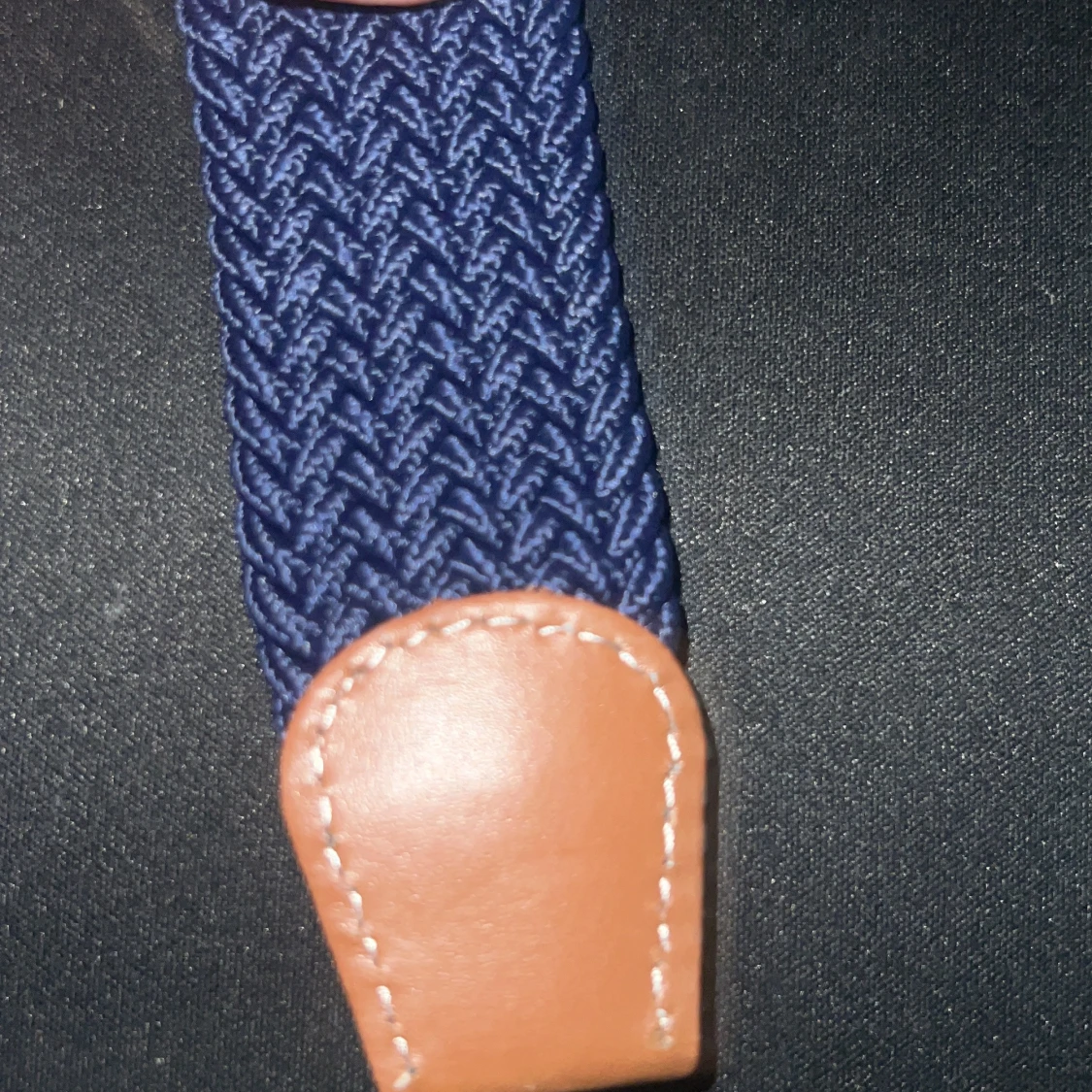 Säljer ett mörkblått flätat bälte med snygga bruna skinn-detaljer och silverspänne. Bältet har en flexibel och stilren design som passar till många outfits. Perfekt accessoar för att lyfta din look.