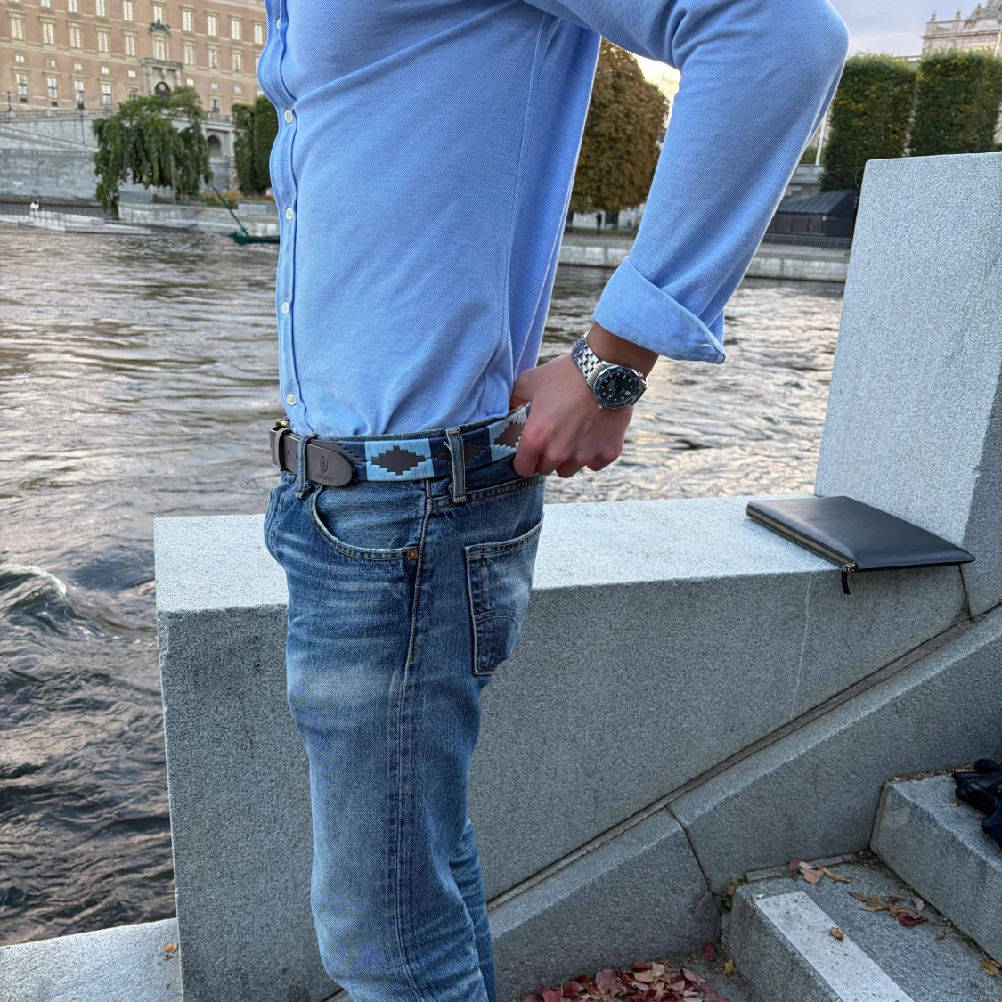 Helt nya skärp för endast 329 kr, de finns storlekarna 100-115 cm .gjorda med mjukt högkvalitets läder med brodering i mörk blå och ljus blå färg. Gör så att din outfit sticker ut mer med Nordfors bälten!