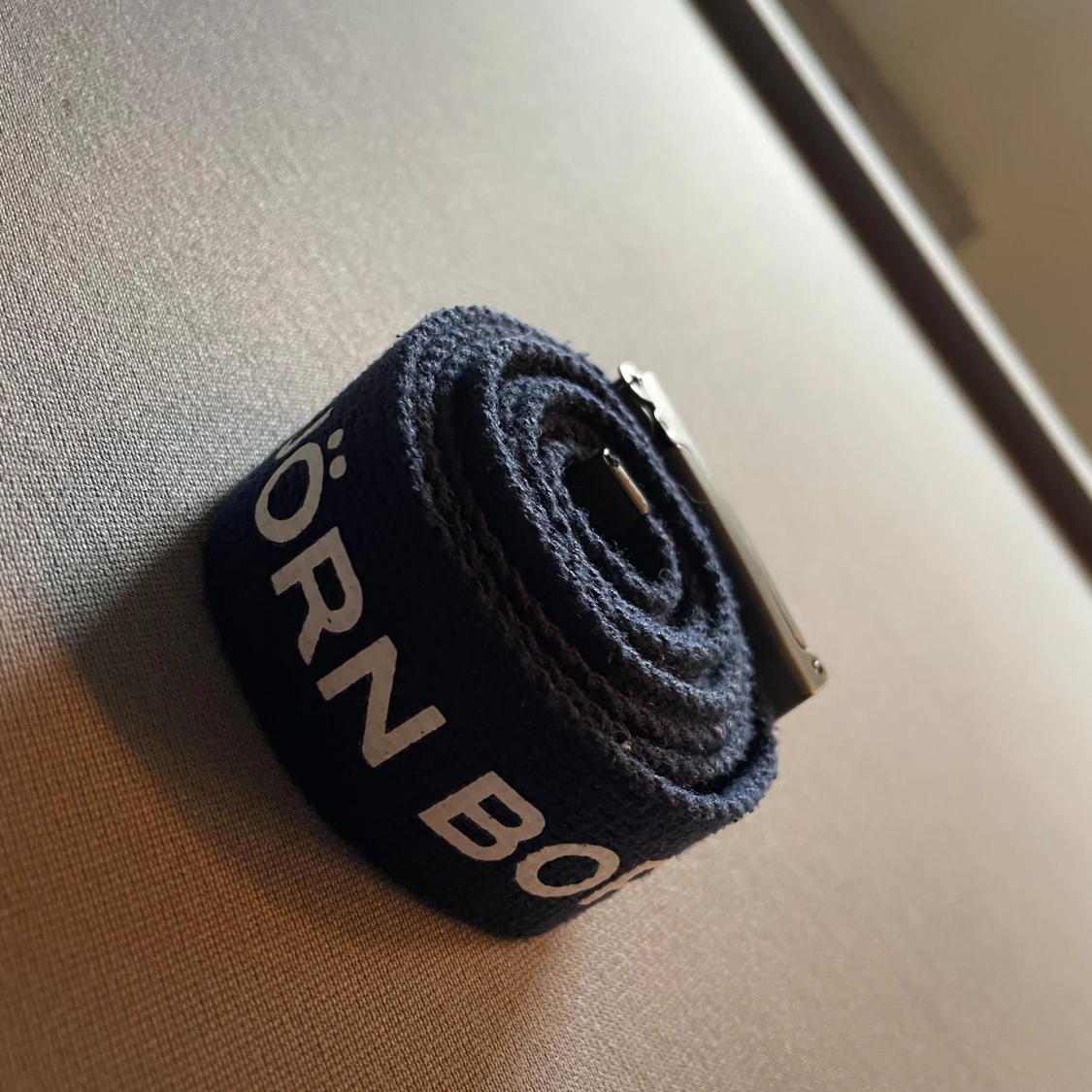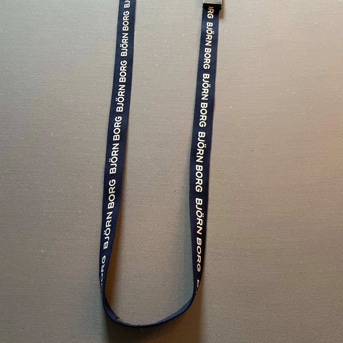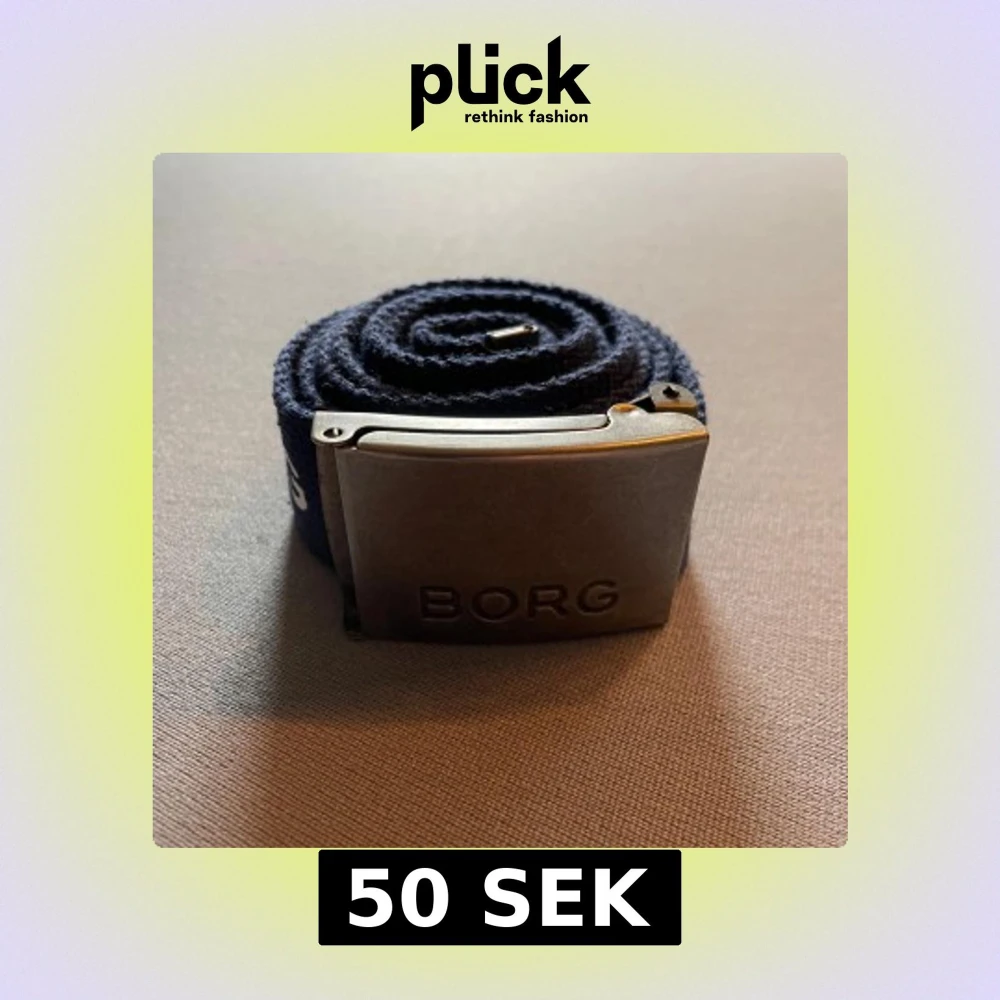 Säljer ett mörkblått tygbälte från Björn Borg med silverfärgat spänne där det står 'BORG'. Bältet har tydlig logga längs hela bandet och passar perfekt till jeans eller casual outfits.