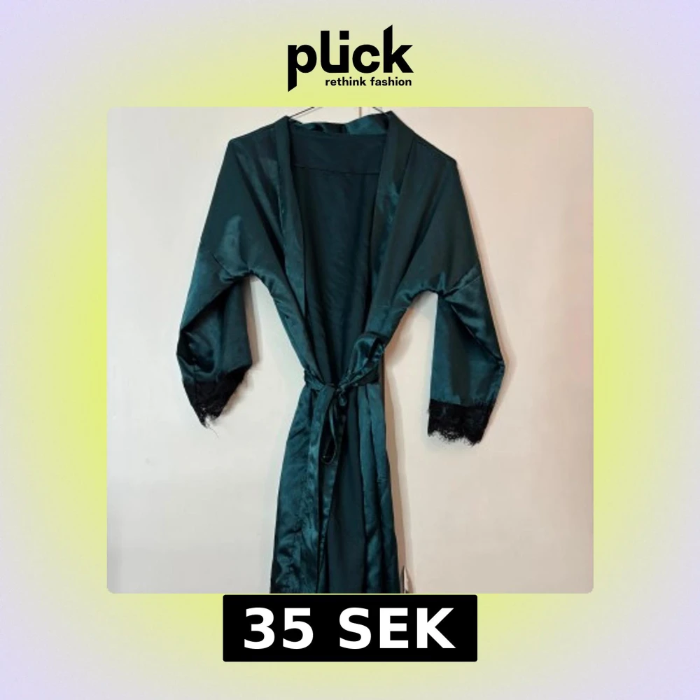 Snygg mörkgrön morgonrock i satinliknande material med knytband i midjan. Svarta spetsdetaljer vid armarna och vid slutet av morgonrocken. Den är från shein och skulle tro det är storlek XS-S. Aldrig använd så nyskick