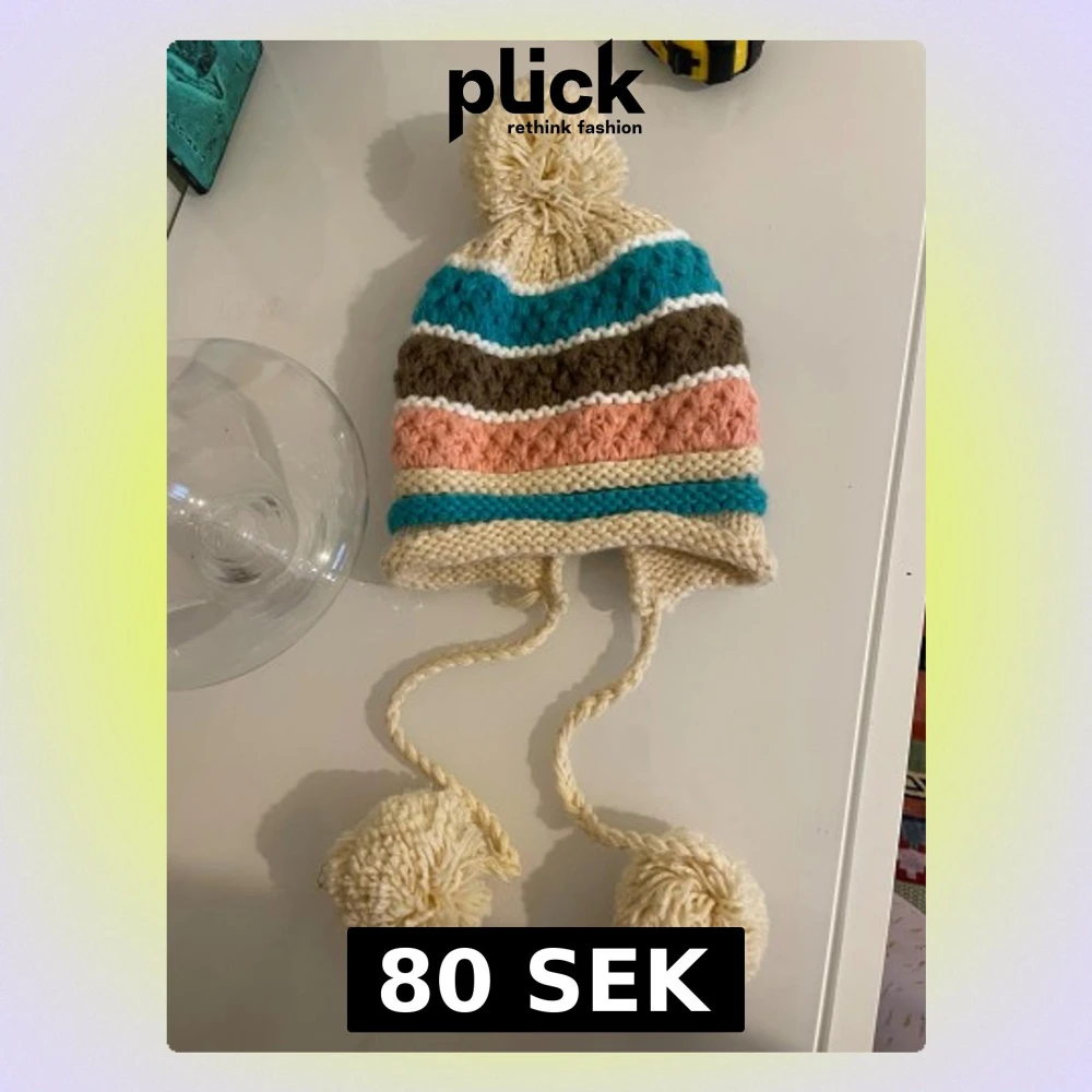 Säljer en mysig stickad mössa med breda ränder i beige, turkos, brun och ljusrosa. Mössan har en stor tofs upptill och två långa snören med fluffiga bollar i ändarna. Perfekt för kalla dagar och riktigt skön att ha på sig.passar alla onezise .har två stycken kvar helt nya oanvända .80krstycken