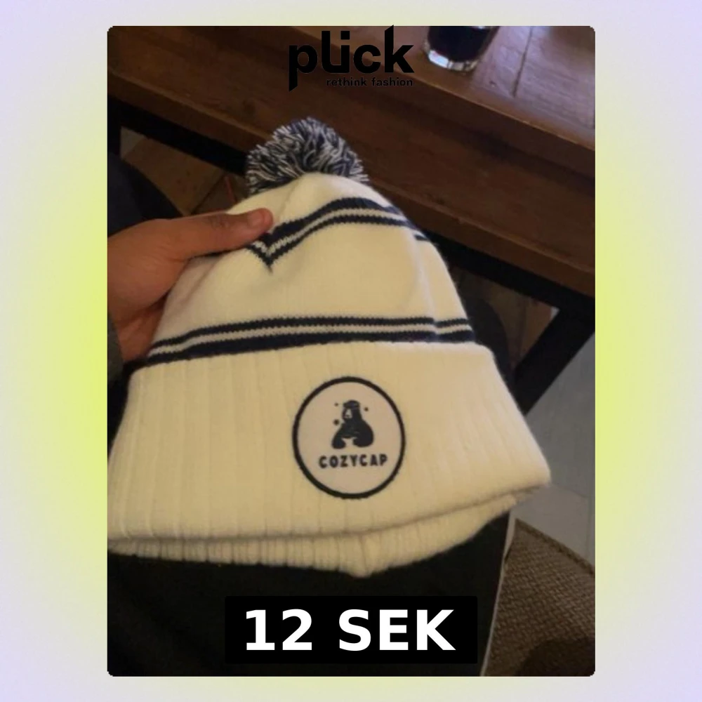 Bilden visar en vit mössa med blå ränder och en blå-vit tofs från Cozycap, inte en väst.